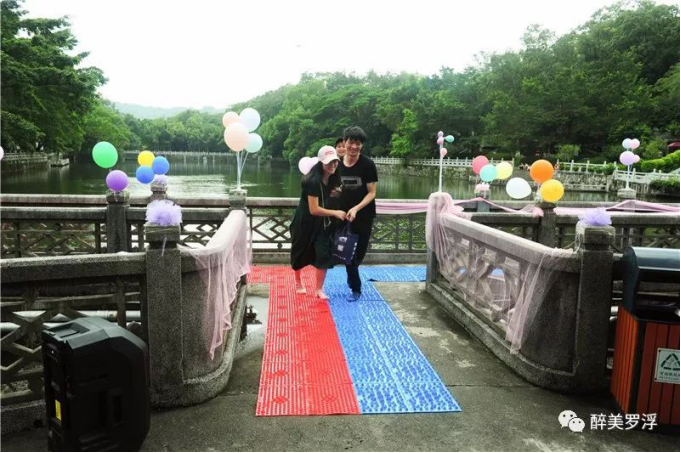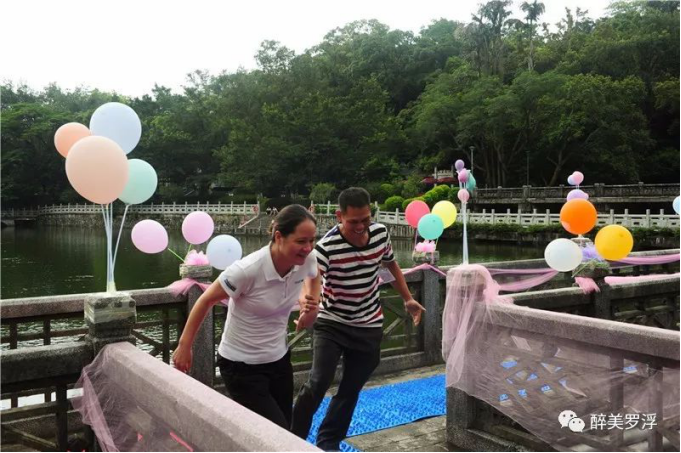 “同甘共苦”環節,情侶分別從湖心橋兩端的男女指壓板賽道,赤腳通過并吃完一杯甜蜜蜜的豆腐花,寓意兩人的愛情歷經千辛萬苦,最終走向甜蜜幸福。更有情侶挑戰背著自己的愛人,赤腳跑完全程指壓板賽道。來自博羅的余先生表示,背著愛人跑指壓板賽道,雖然腳底很疼,但這是男人的責任,是愛的重量。