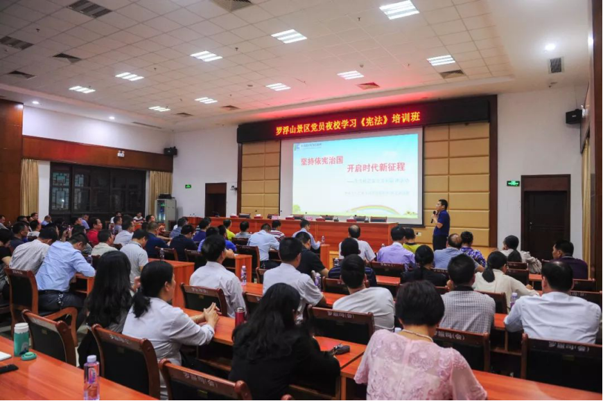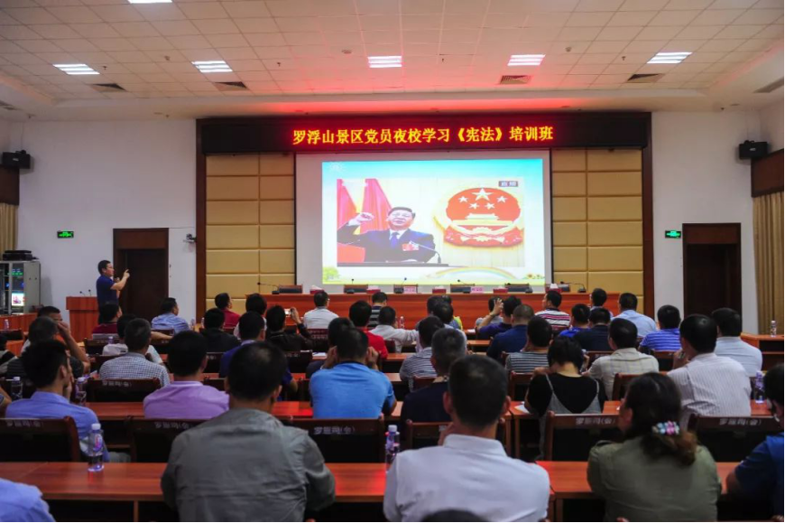 為了更加深入的學習憲法內容,進一步強化學員的憲法意識,引導學員帶頭自覺的尊崇憲法、遵守憲法、維護憲法。11月14日晚上,羅浮山景區召開黨員夜校學習《憲法》培訓班,羅浮山景區黨委、管委會領導班子成員、管委會機關黨支部全體黨員、旅游公司全體黨員、各村(社區)“兩委”干部、小組長、林場、派出所、學校黨支部委員,共約200人參加了會議。本次會議邀請了廣東法村律師事務所的陳文濤律師進行對憲法的解讀。會議由景區黨委書記、管委會主任孫立武同志主持。