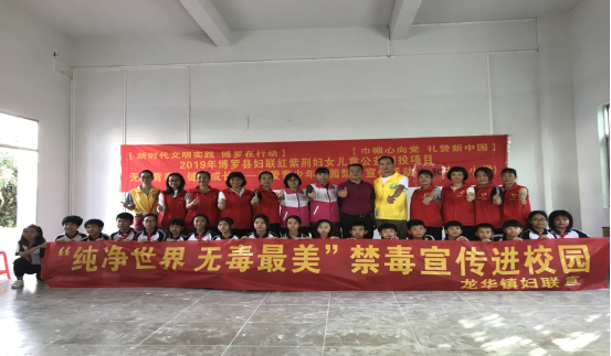 六月的陽光燦爛奪目,六月的鮮花絢麗多彩。在6·26國際禁毒日前夕,由博羅縣婦聯主辦、博羅縣惠民社工承辦、龍華鎮婦聯、團委、禁毒辦、民愛社工協助開展的2019博羅縣婦聯婦女兒童公益創投項目“無毒青春,健康成長”關愛兒童青少年校園禁毒宣傳活動于6月19日下午在龍華寧和小學隆重舉行。龍華鎮委委員、婦聯主席林小梅同志,鎮婦聯、鎮團委、禁毒辦和惠民社工、民愛社工工作人員、志愿者、寧和小學高年級師生近200人參加了這次活動。活動由林景良校長主持。