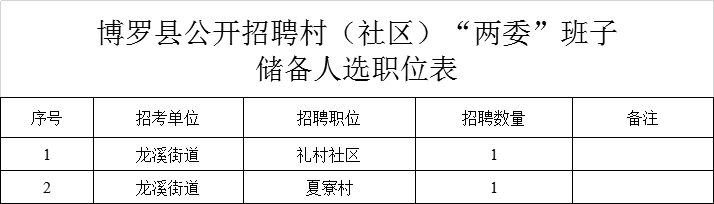 結(jié)合村(社區(qū))“兩委”班子建設(shè)專題調(diào)研成果,公開招聘2名村(社區(qū))“兩委”班子儲備人選,具體職位見《博羅縣龍溪街道公開招聘第三批村(社區(qū))“兩委”班子儲備人選職位表》(附件1)。
