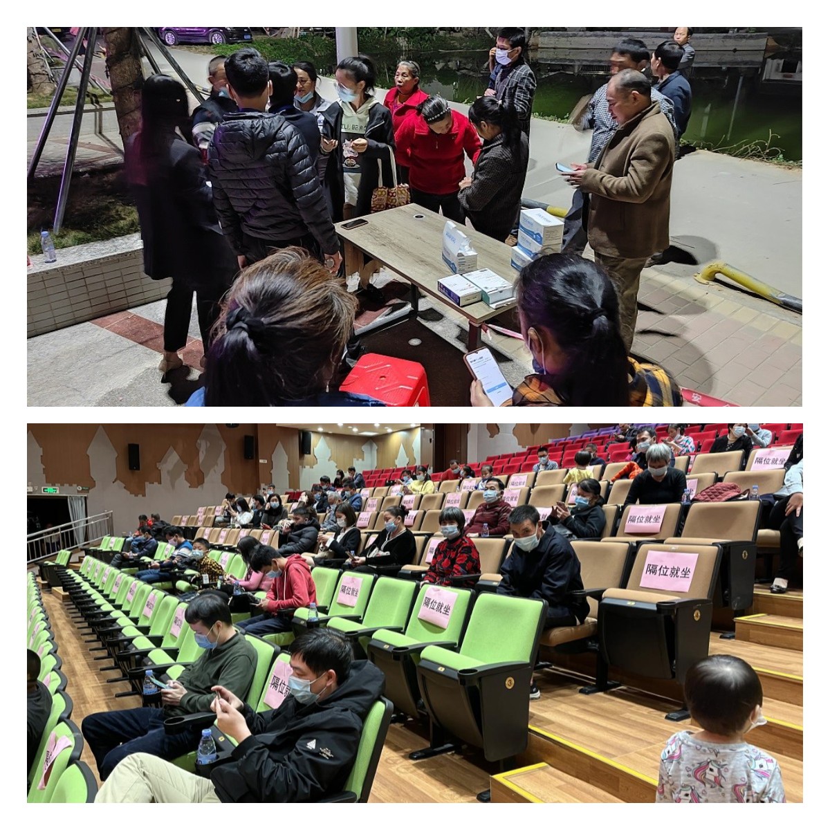 活動前,街道工作人員和村(居)工作人員、志愿者們按照疫情防控相關工作要求,指導群眾做好配戴口罩、掃粵康碼進場、隔位就坐等防疫措施,并引導群眾有序入場就坐。