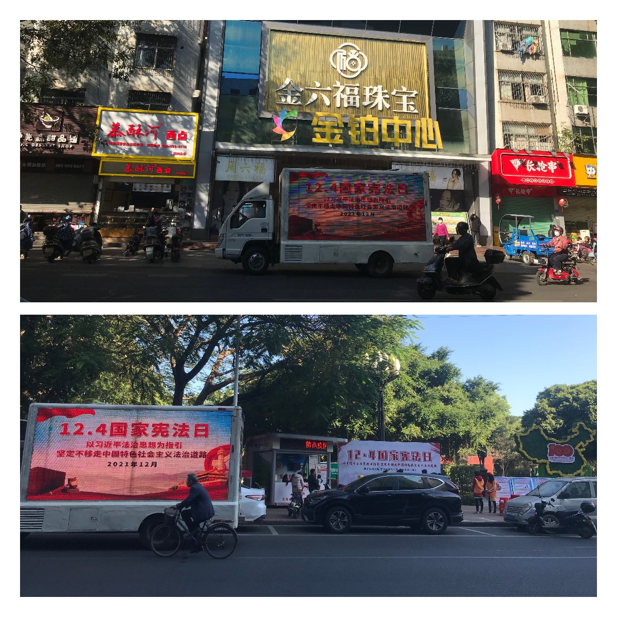 會(huì)場(chǎng)下配合LED宣傳車進(jìn)行同步宣傳,在金鉑廣場(chǎng)、金田市場(chǎng)、萬福達(dá)廣場(chǎng)等人群流動(dòng)較大的地點(diǎn)循環(huán)播報(bào)法律知識(shí),讓周邊群眾能夠深入感受普法宣傳的濃厚氣氛,使他們對(duì)于法律知識(shí)的了解在潛移默化中得到熏陶,由此推動(dòng)形成由上到下,由平面到立體的多元化普法宣傳局面。