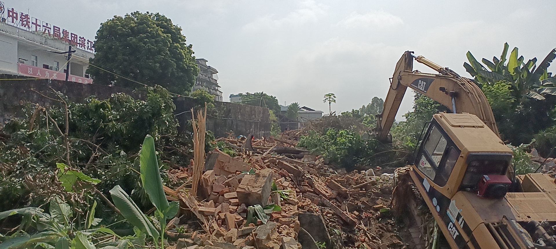 最后,王玉添宣布房屋拆遷工作正式開始。兩臺挖掘機同時發動,對現場的老舊房屋及地面附著物進行拆除。
