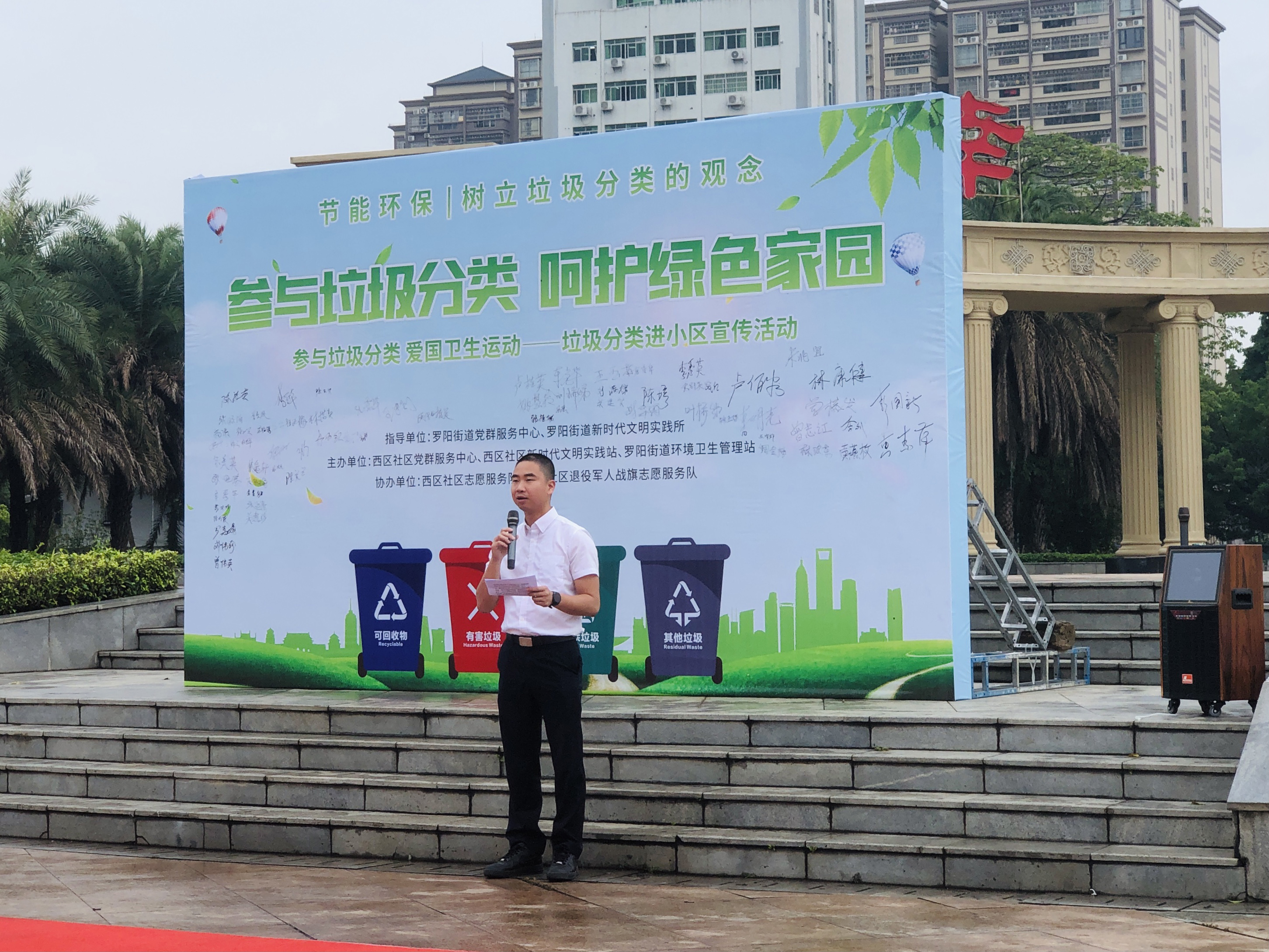 為倡導(dǎo)社區(qū)居民在生活中踐行保護(hù)生態(tài)環(huán)境、低碳生活的理念,樹立節(jié)能環(huán)保、垃圾分類的觀念,深入推進(jìn)垃圾分類工作。5月9日上午9時,羅陽街道西區(qū)社區(qū)黨群服務(wù)中心聯(lián)合西區(qū)社區(qū)新時代文明實踐站和環(huán)境衛(wèi)生管理站共同開展愛國衛(wèi)生運動——“參與垃圾分類,呵護(hù)綠色家園”為主題宣傳活動開幕儀式,向廣大居民宣傳垃圾分類知識。