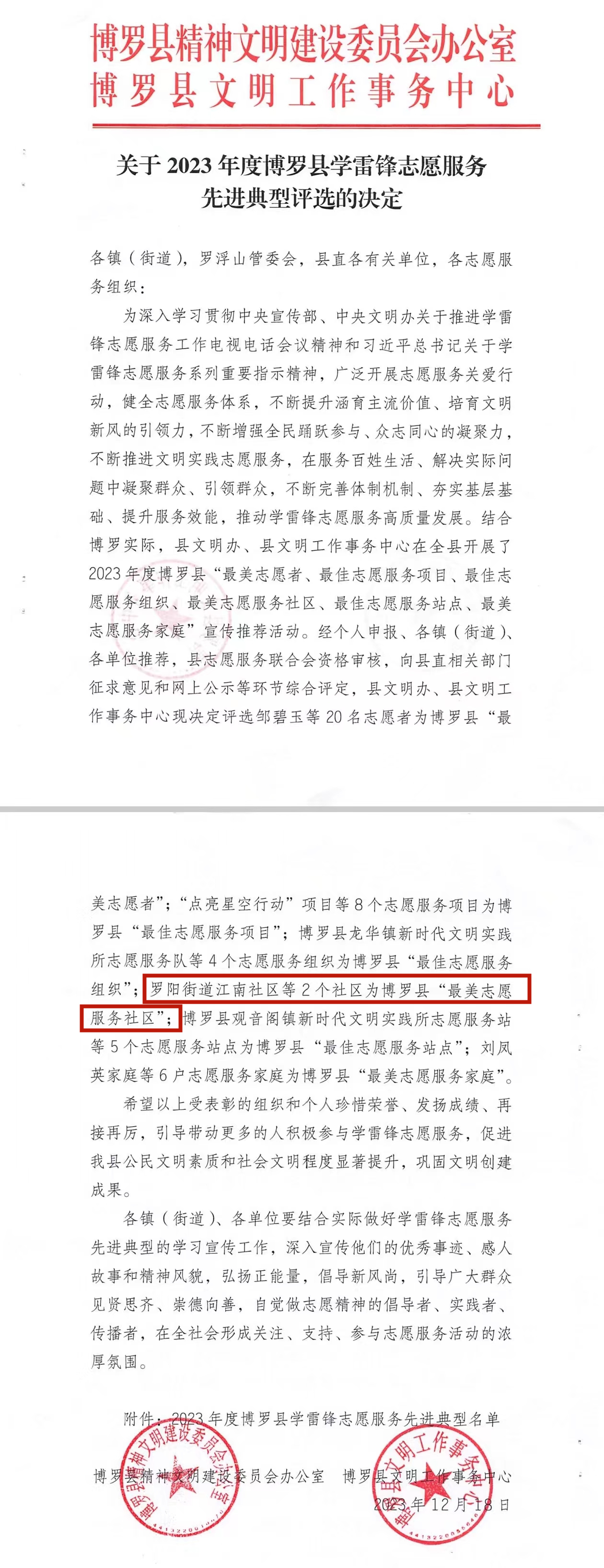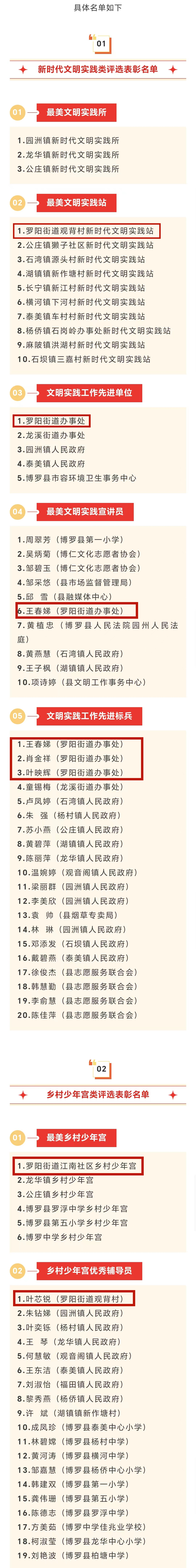 在評選表彰名單中,羅陽街道辦事處被評為文明實踐工作先進單位;羅陽街道觀背村新時代文明實踐站獲評最美文明實踐站;羅陽街道王春娣獲評最美文明實踐宣講員,羅陽街道王春娣、肖金祥、葉映輝等3人獲評文明實踐工作先進標兵;羅陽街道江南社區鄉村少年宮獲評最美鄉村少年宮,羅陽街道葉芯銳獲評鄉村少年宮優秀輔導員。此外,在2023年度博羅縣學雷鋒志愿服務先進典型評選中,羅陽街道江南社區獲評最美志愿服務社區。