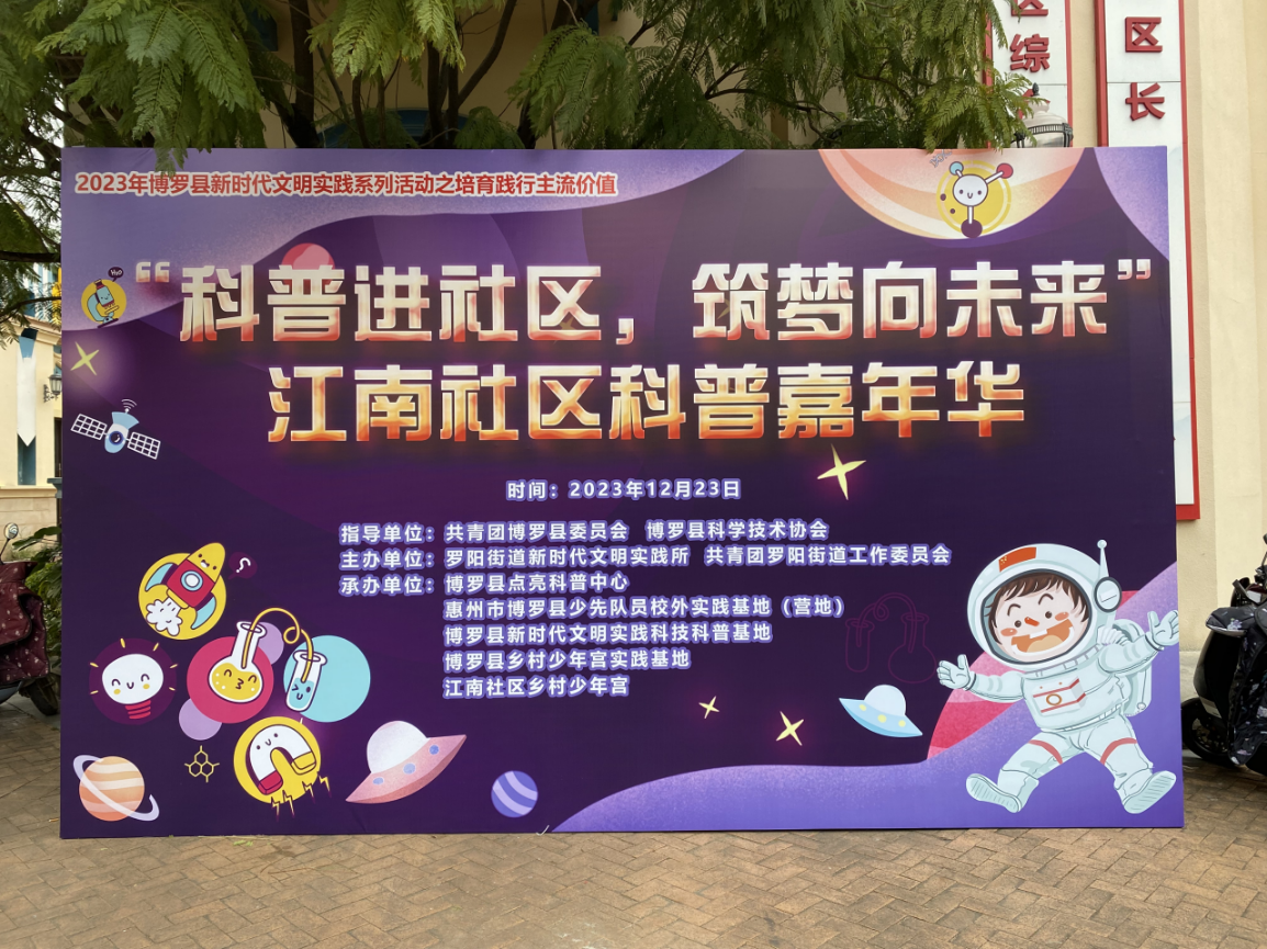 為激發社區青少年兒童學科學、愛科學、用科學的熱情,了解科學的神奇與魅力,培養廣大群眾的創新意識、實踐能力和科學精神。2023年12月23日,“科普進社區,筑夢向未來”江南社區科普嘉年華在羅陽街道江南社區黨群服務中心舉行。本次活動由共青團博羅縣委員會、博羅縣科學技術協會指導,羅陽街道新時代文明實踐所、共青團羅陽街道工作委員會主辦,博羅縣點亮科普中心、惠州市博羅縣少先隊員校外實踐基地(營地)、博羅縣新時代文明實踐科技科普基地、博羅縣鄉村少年宮實踐基地、江南社區鄉村少年宮聯合承辦。