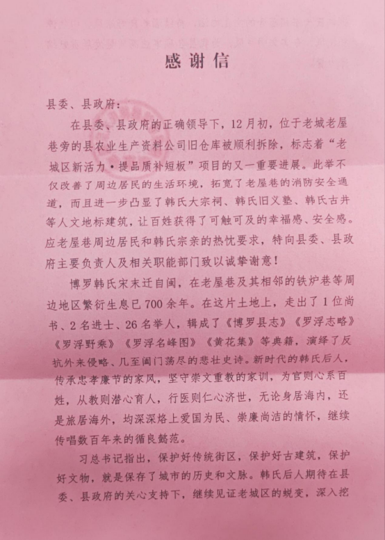 一封感謝信,不僅是群眾的信任與褒獎,更是督促與鼓勵,下來,我街道將繼續緊密聯系各縣直部門,高強度推進博羅縣“老城區新活力·提品質補短板”項目涉及的征地拆遷工作,確保如期高質完成目標任務,不斷提升人民群眾生活品質和獲得感、幸福感、安全感。