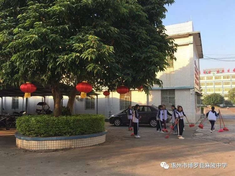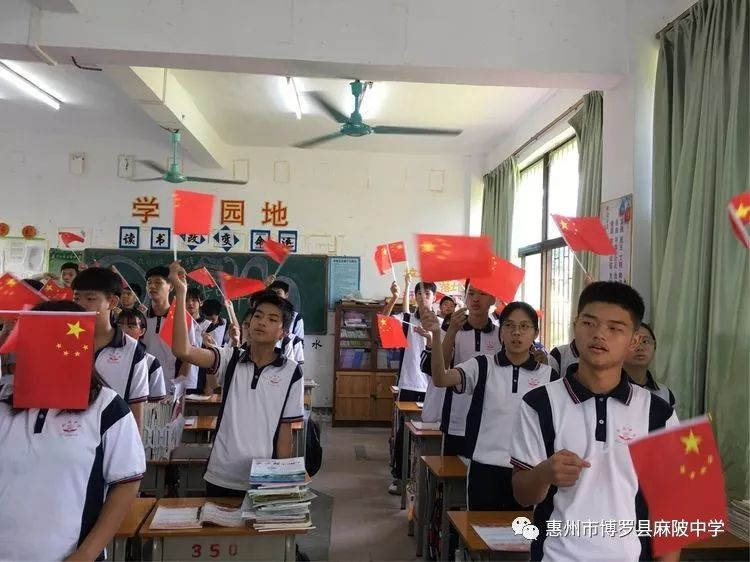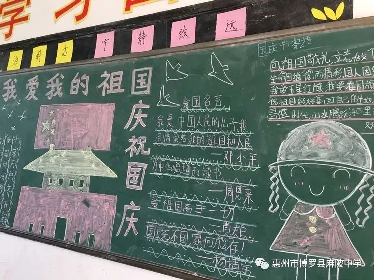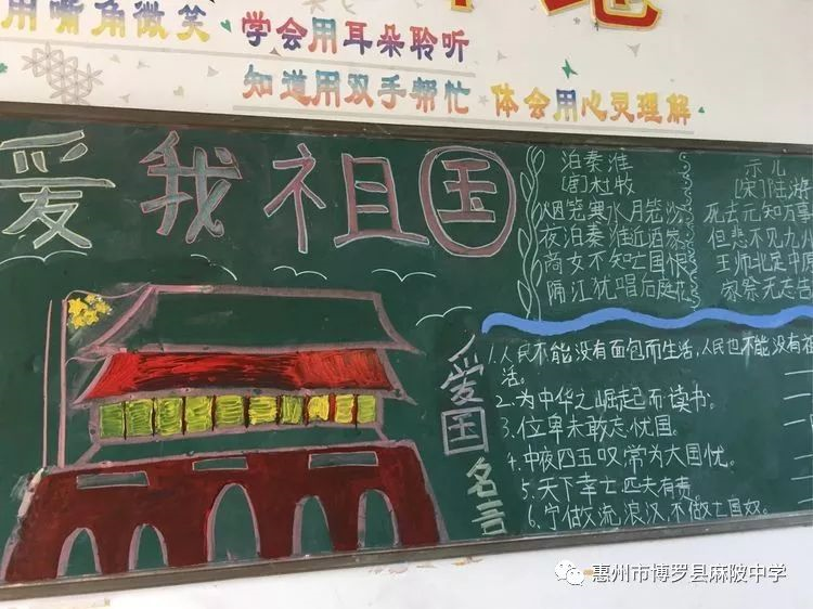 在將迎來中華人民共和國成立70周年之際,為激發(fā)學(xué)校師生的愛國熱情,進一步加強全民愛國主義教育,麻陂中學(xué)積極營造慶祝國慶的氛圍,校門囗及周邊插滿了彩旗和鮮艷的五星紅旗,校園內(nèi)的樹也掛上了節(jié)日的紅燈籠,校門的電子屏幕上顯示著最為耀眼的字幕"熱烈慶祝中華人民共和國成立70周年!"每間課室的黑板報上全是祝福中華人民共和國成立70周年的內(nèi)容。在上學(xué)放學(xué)時間段也增設(shè)了"護校隊"護學(xué)崗,保證國慶前后學(xué)校祥和安全。校園處處整潔,人人歡快,師生們臉上洋溢著幸福的笑容,整個校園滿是喜慶的氣氛。每位老師與學(xué)生以實際行動來共同表達(dá)對祖國的祝福和熱愛。