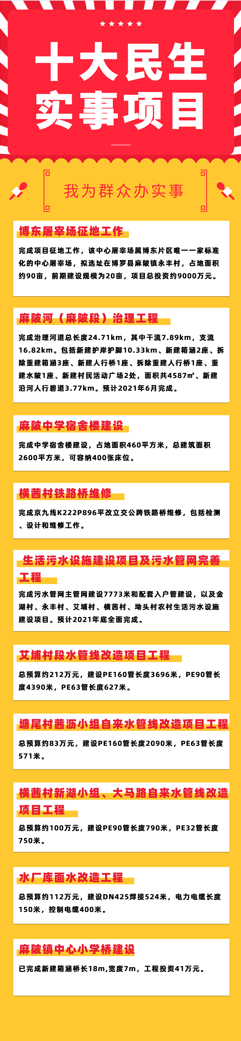 學(xué)黨史,辦實事。為切實解決好群眾的關(guān)心事操心事煩心事揪心事,今年麻陂鎮(zhèn)通過鎮(zhèn)人大代表在鎮(zhèn)第十七屆人民代表大會第十一次會議上票決出“麻陂鎮(zhèn)2021年十大民生實事”(博東屠宰場征地工作;麻陂河(麻陂段)治理工程;麻陂中學(xué)宿舍樓建設(shè);橫茜村鐵路危橋維修;圩鎮(zhèn)及農(nóng)村生活污水設(shè)施建設(shè)及污水管網(wǎng)完善工程;艾埔村及塘尾村茜瀝小組、橫茜村新湖小組、大馬路的自來水管線改造;自來水廠庫面水改造工程;鎮(zhèn)中心小學(xué)橋建設(shè)),并列入麻陂鎮(zhèn)2021年度重要議事日程,實行鎮(zhèn)領(lǐng)導(dǎo)班子成員領(lǐng)辦、專班跟蹤、倒排工期,確保限期按質(zhì)按量完成任務(wù)。