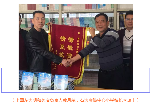 麻陂鎮(zhèn)愛心商家-明和藥店已連續(xù)三年為學(xué)校捐贈(zèng),2017年麻陂明和藥店攜手羅浮山國藥向全鎮(zhèn)小學(xué)1-2年級(jí)學(xué)生捐贈(zèng)拼音作業(yè)本6000多本,2018年向麻陂鎮(zhèn)小學(xué)捐贈(zèng)《學(xué)生安全教育手冊(cè)》2500冊(cè),2019年再次向麻陂鎮(zhèn)小學(xué)捐贈(zèng)《學(xué)生安全教育手冊(cè)》2600冊(cè),用公益行動(dòng)回饋社會(huì),得到了當(dāng)?shù)厝罕姾蛷V大師生的廣泛贊譽(yù)。