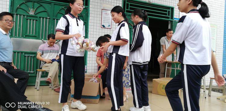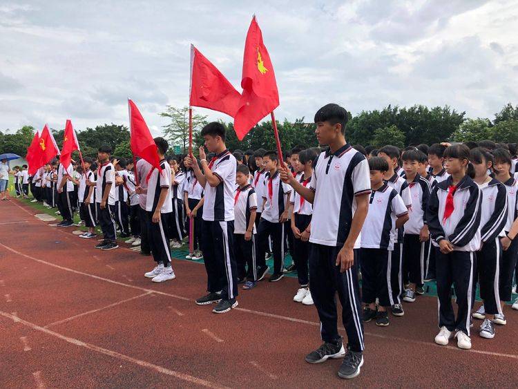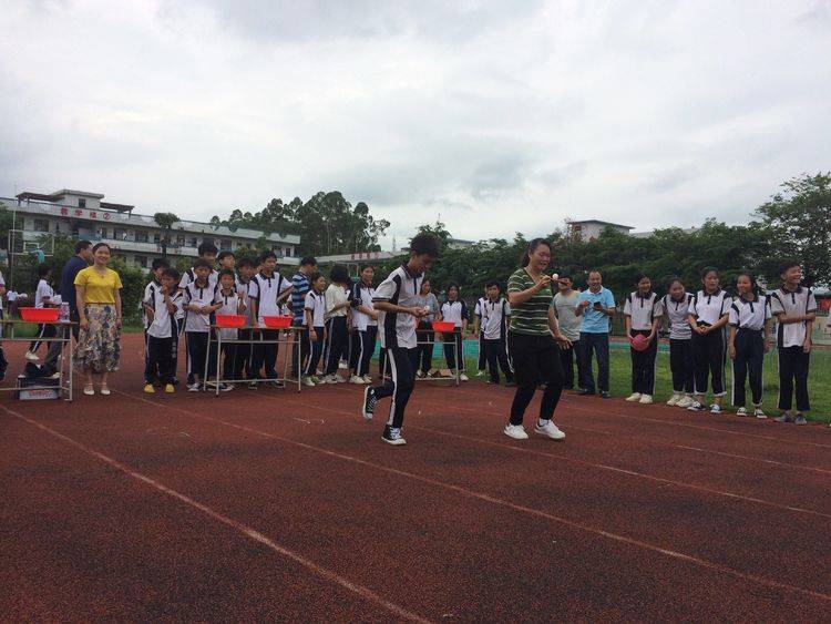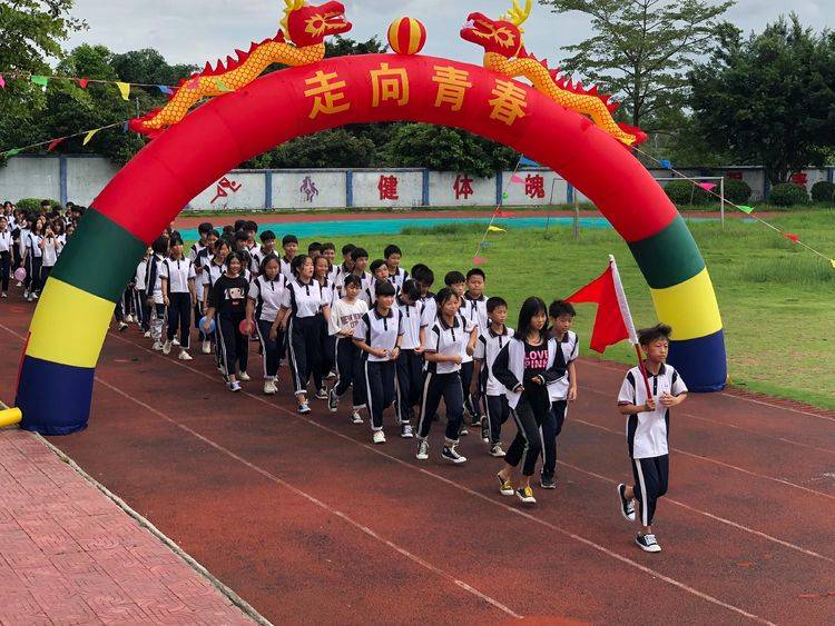 活動中,校長羅干洪帶來了學校領導對同學們的關心、慰問和祝賀,他希望每一位同學都成為德、智、體、美、勞全面發展的社會主義新人。接著,我們的少先隊員們即將跨過他們人生中的童年階段,告別少先隊,加入共青團。少先隊大隊輔導員李淑玲宣布少先隊員們離隊決定,全體少先隊員在七(2)班同學鄭彩玲的帶領下宣誓,隨后繞著操場跑一圈穿過“走向青春”龍門,摘下紅領巾和退隊旗。這簡單又隆重的儀式蘊含著無盡的意義,昭示著同學們告別了曾經燦爛的童年,邁進了青春的大門。退隊儀式結束后,同學們歡度最后一個六一兒童節,在緊張愉快的氣氛中,進行了“跳繩”、“親子運球”、“猜謎語”和“彩卡紙”等趣味比賽活動,同學們通過自己和團隊及家長一起努力拿到了豐富的獎品。