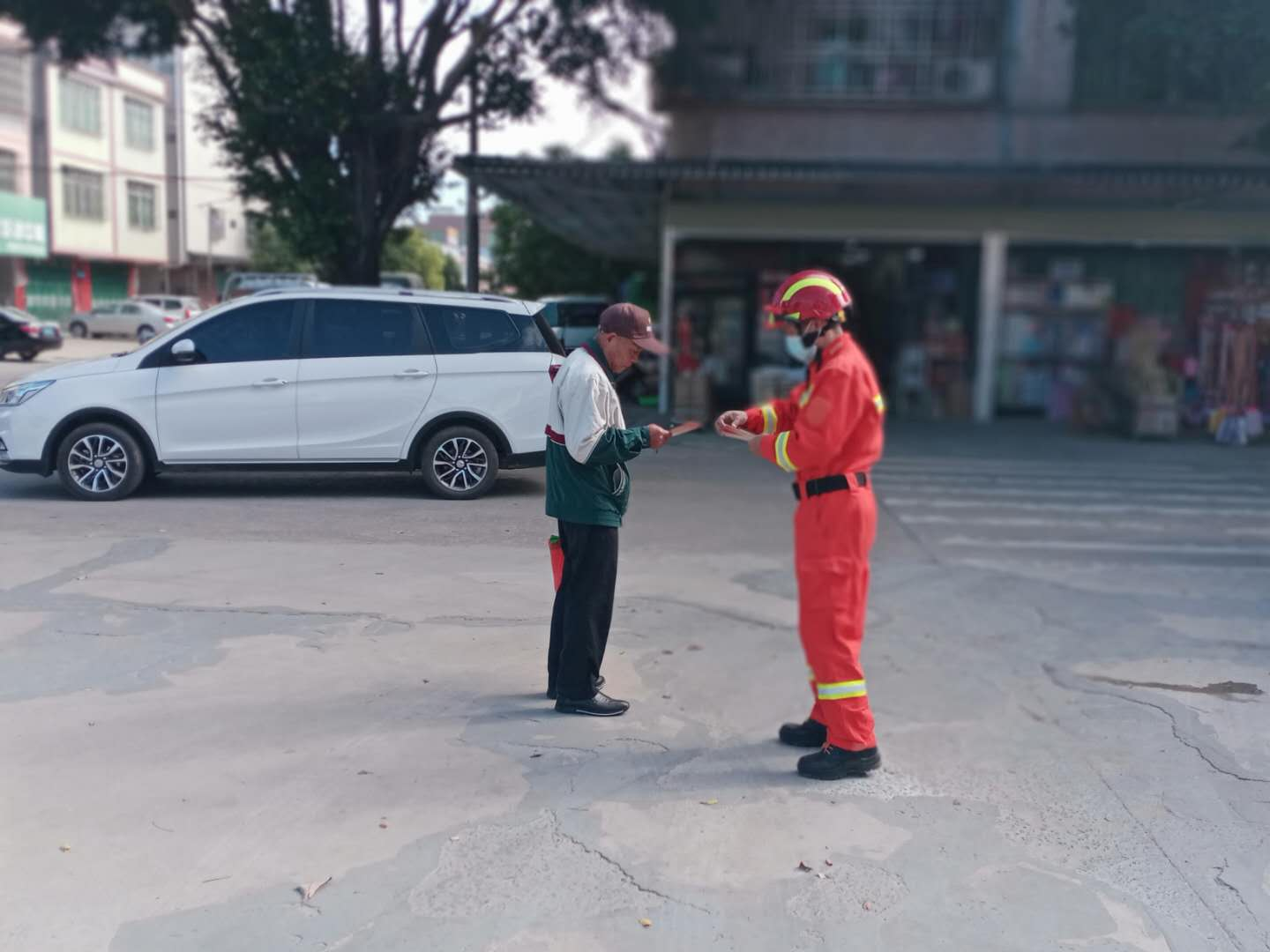 宣傳過程中,專職隊宣傳員以講解、散發宣傳資料等形式,結合印發的各類消防安全手冊,向過往群眾宣傳消防法律法規、家庭安全用火用電基本常識、遇到火災自救及逃生方法等。回答群眾提出的相關問題,積極引導廣大人民群眾樹立“寧可十年無火,不可一日不防”的思想,緊繃防火這根弦,盡最大努力防范火災的發生。
