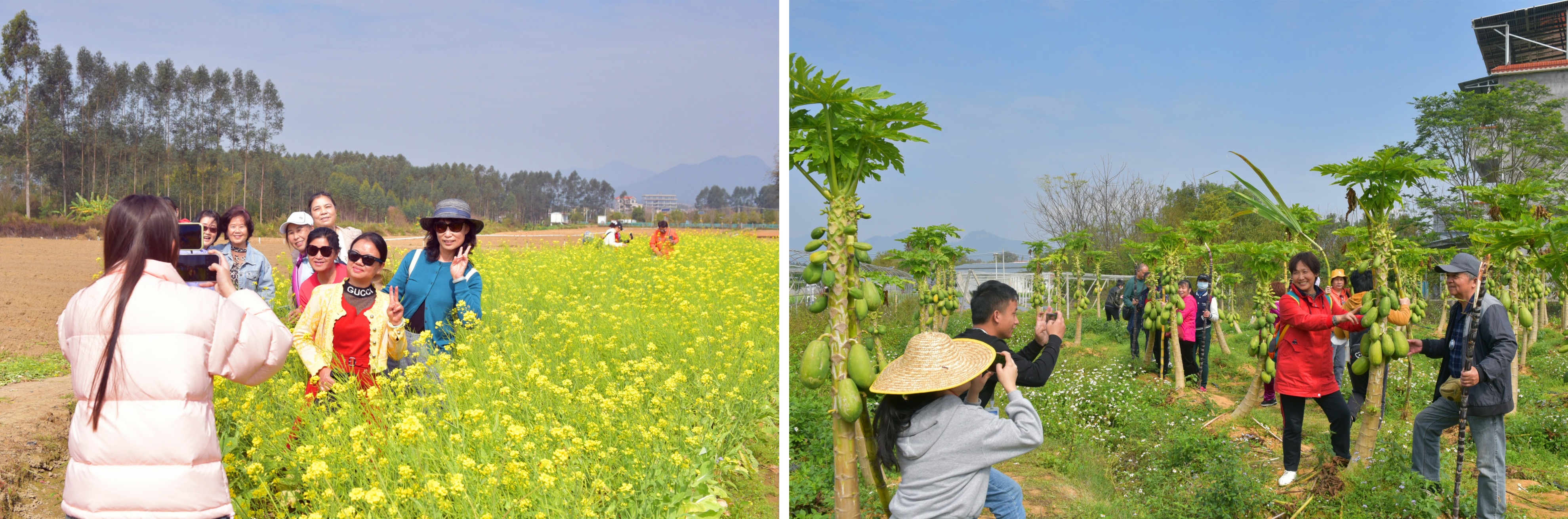 游客們在公園里與油菜花、木瓜樹等田園風光拍照打卡留念,在一片新綠中定格春天的美麗瞬間。