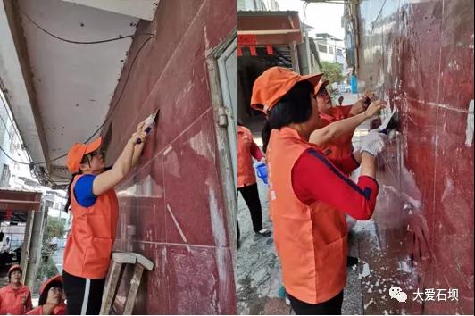 此次主題黨日活動中,石壩鎮(zhèn)全體黨員干部職工以網(wǎng)格化包干負(fù)責(zé)為原則,深入到圩鎮(zhèn)范圍內(nèi)開展“地毯式”環(huán)境綜合整治志愿服務(wù)活動。大家身穿“紅馬甲”志愿服,穿過街頭巷尾,有的拿著火鉗、鐵鍬、掃帚等工具,撿拾垃圾、消除衛(wèi)生死角;有的利用鏟子、噴壺、清洗劑等工具,對惱人的“牛皮癬”、破舊的公益宣傳海報(bào)等進(jìn)行清理;還有的上門勸導(dǎo)群眾、商家不要亂推、亂放、占道經(jīng)營,影響市容、妨礙交通。大家充分發(fā)揚(yáng)了“不怕臟、不怕累、不怕苦”的精神,盡管烈日當(dāng)頭,但志愿者們卻毫不退縮,汗水夾雜著灰塵鋪滿了全身,只為石壩群眾換來一個(gè)舒適整潔的環(huán)境。