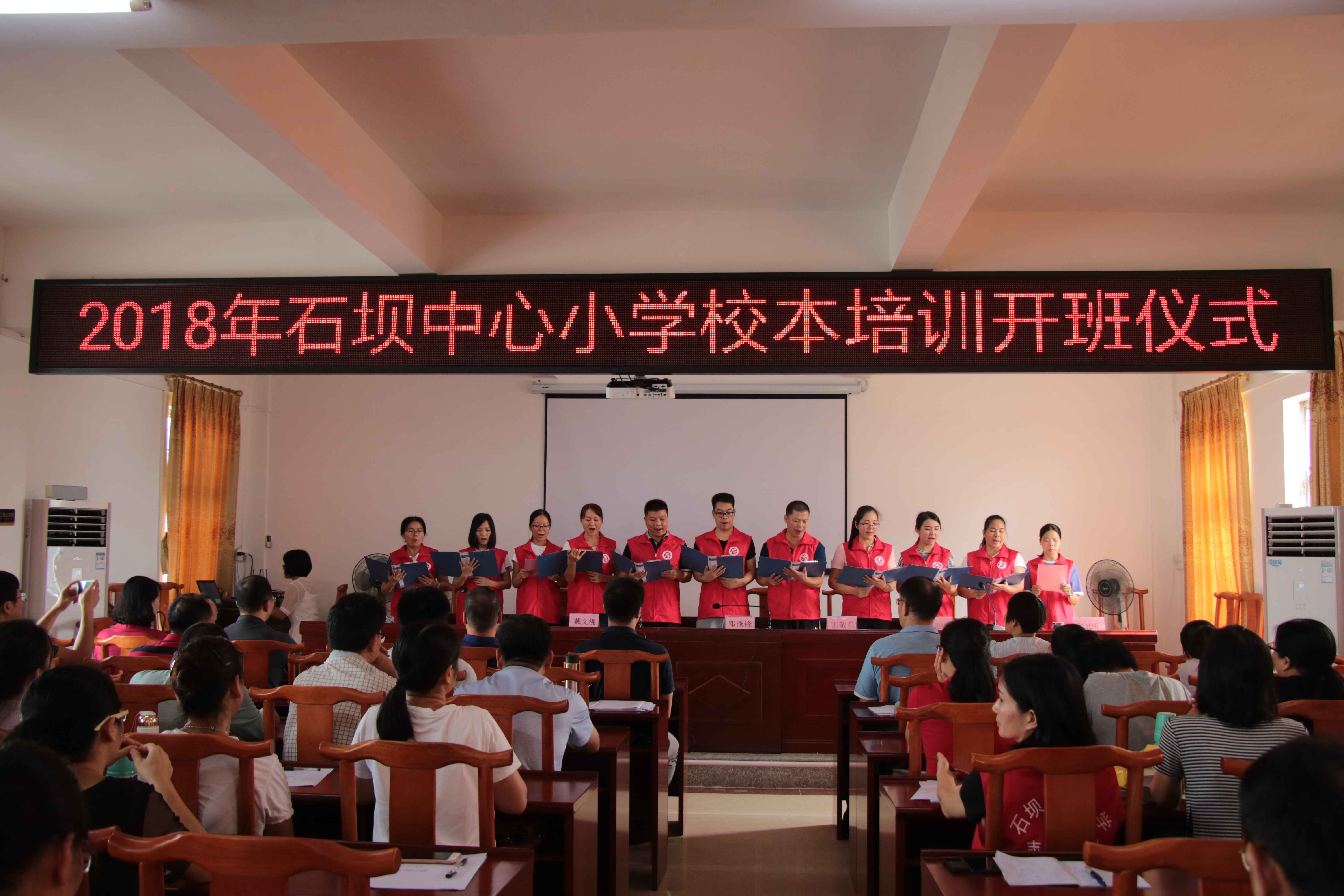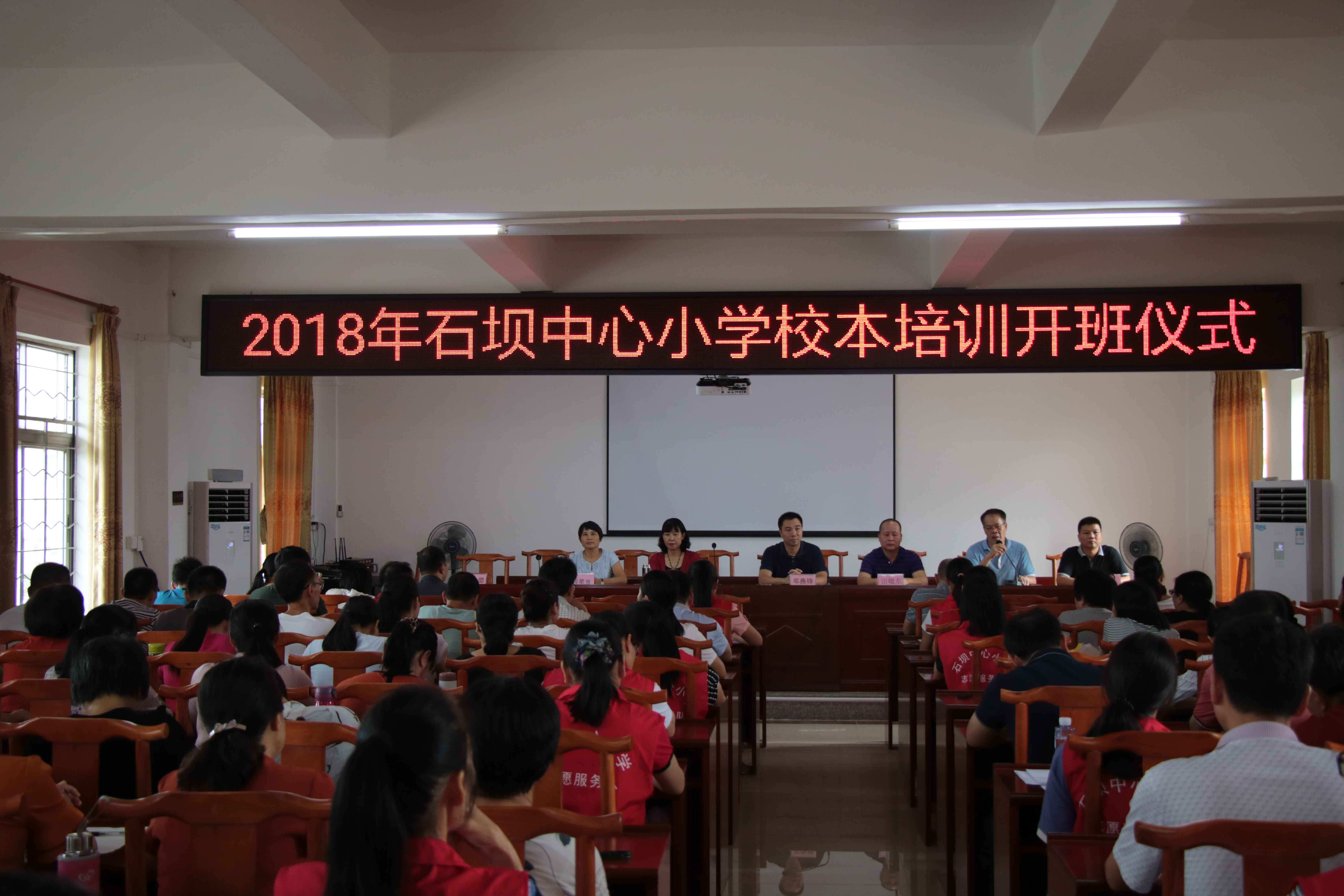 2018年8月28日上午,石壩中心小學校本培訓在鎮人民政府老辦公樓三樓會議室正式開班。鎮黨委書記鄧燕鋒同志、鎮人大主席田敬東同志參加本次開班儀式并發表重要講話。開班儀式上,鄧燕鋒同志對廣大教師提出了有擔當、重團結、常感恩、懷愛心、當明星的五點殷切希望,得到了廣大教師的深切認同。同時,11名志愿者教師共同朗誦了習主席的《不忘初心》。最后,以“智慧教師”、“教室底線”、“終身成長”、“美樂教育,幸福課堂”為主題的培訓活動正式開始。