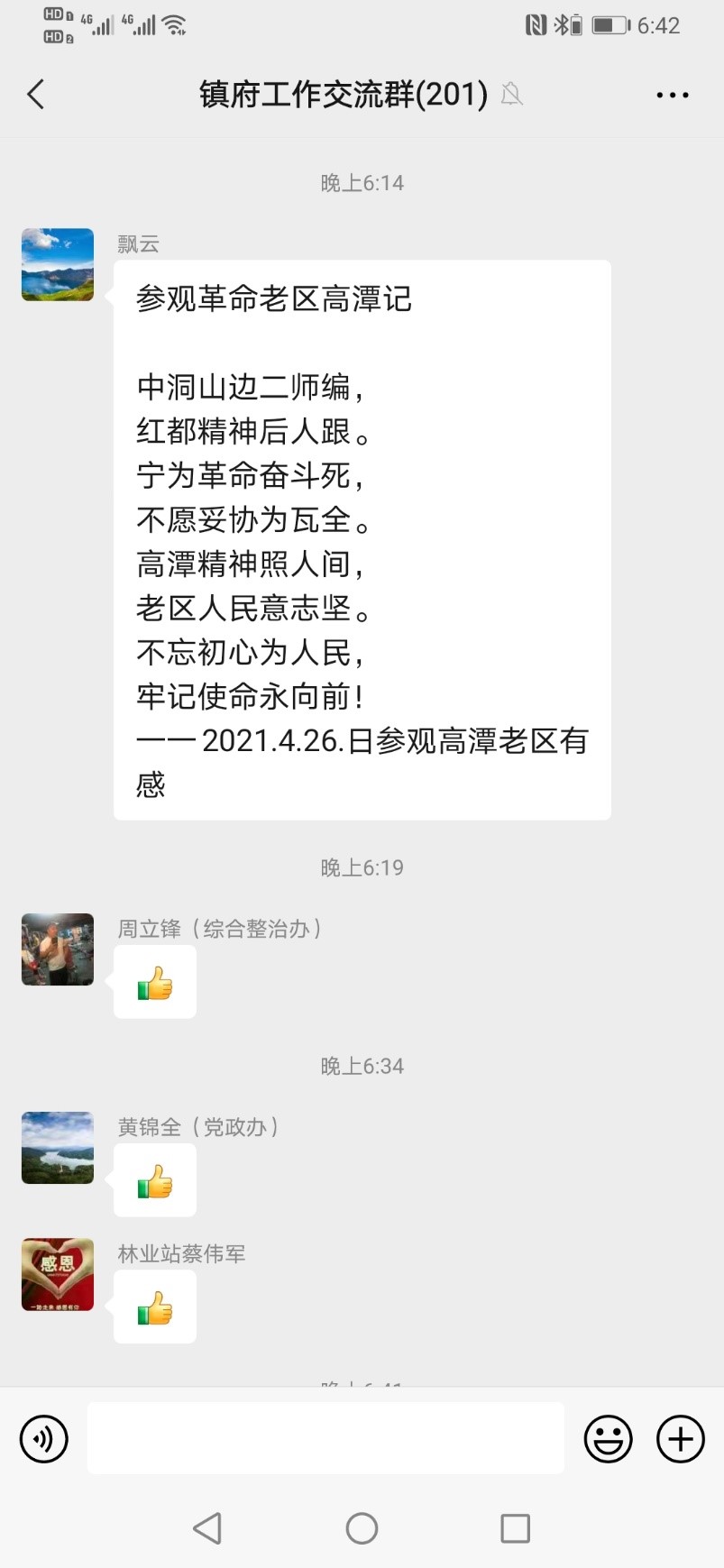 ▲老干部黨支部黨員王光華在鎮政府交流群發表自己的感想