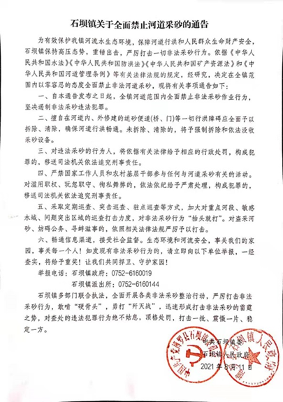 ▲《石壩鎮關于全面禁止河道采砂的通告》