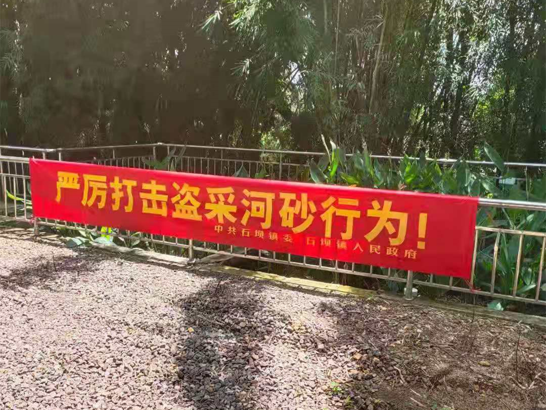 石壩鎮充分依靠群眾,發動群眾,建立有效的投訴舉報渠道,印發《石壩鎮關于全面禁止河道采砂的通告》1000余份并開展入戶宣傳;制作宣傳橫幅26條;鄉村“小喇叭”每天定時播放宣傳音頻,共同打擊非法采砂行為,營造依法采砂、管砂的良好社會氛圍。