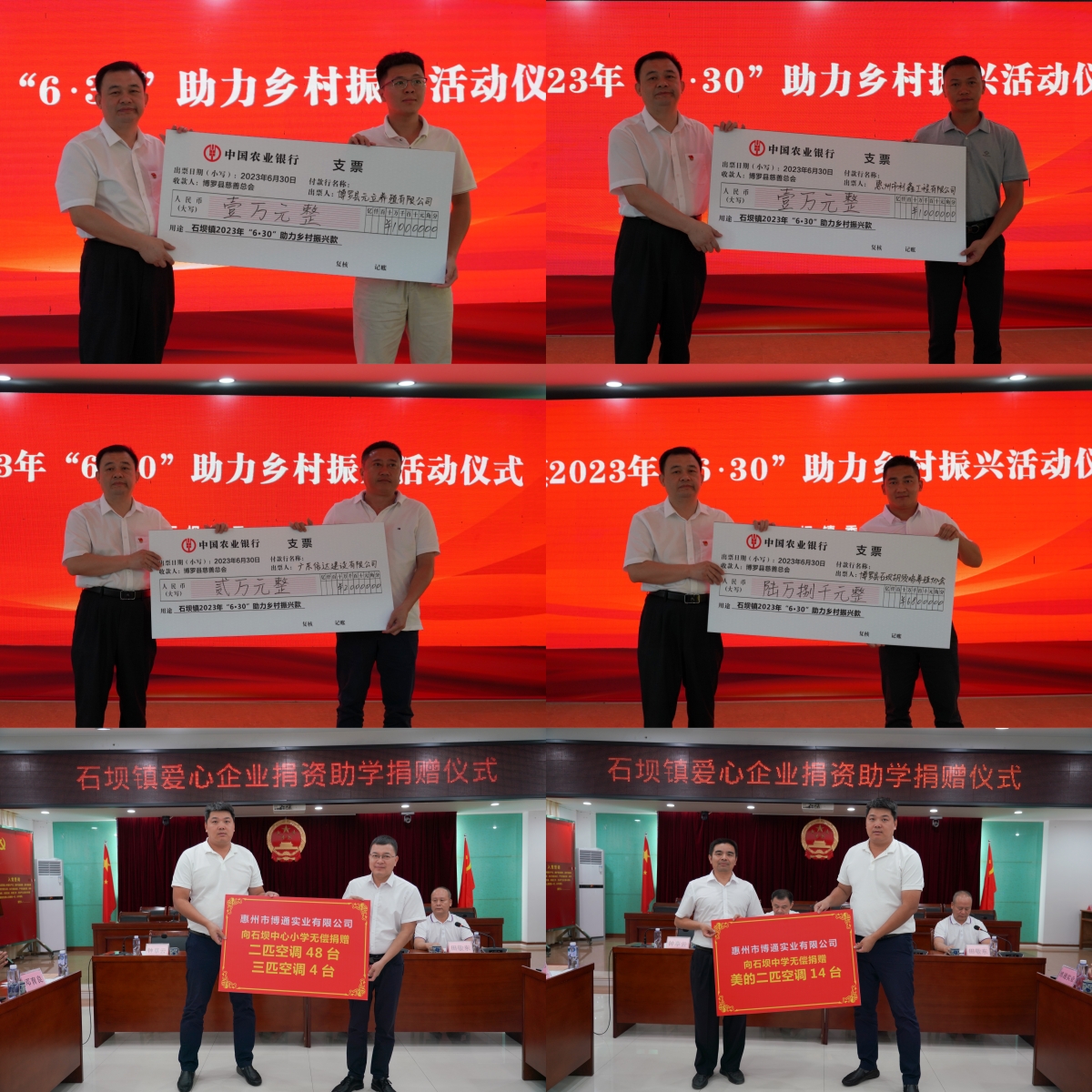 愛(ài)心企業(yè)在行動(dòng),做深做實(shí)村企結(jié)對(duì)幫扶,捐資助學(xué)暖人心,今年以來(lái),“6·30”助力鄉(xiāng)村振興活動(dòng)中,全鎮(zhèn)共募集善款超17萬(wàn)元,其中20多家熱心企業(yè)和社會(huì)熱心人士捐款近14萬(wàn)元;“萬(wàn)企興萬(wàn)村”行動(dòng)中,駿旺、眾原、粵電惠博、建農(nóng)、思源、元立、福和、博通等40多家愛(ài)心企業(yè)為支持教育事業(yè)、兒童節(jié)慰問(wèn)、高考優(yōu)秀學(xué)子助學(xué)金等捐贈(zèng)金額超14萬(wàn)元、捐贈(zèng)空調(diào)66臺(tái)。