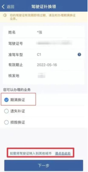 2.如果是惠州市本地駕照,點擊【期滿換證】,如果是外地駕照則點擊頁面最下方藍色小字【如需將駕駛證轉(zhuǎn)入到其他城市,請點擊此處】,并選擇轉(zhuǎn)入惠州;