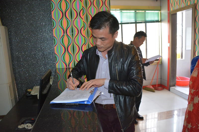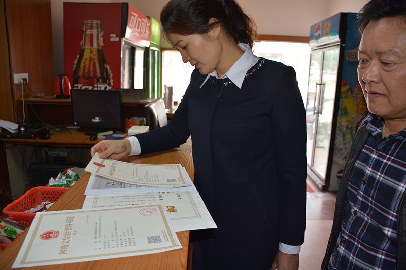 鎮(zhèn)人大主席趙誼莉同志查看文化經(jīng)營場所的營業(yè)許可、文化許可、消防安全等執(zhí)照。