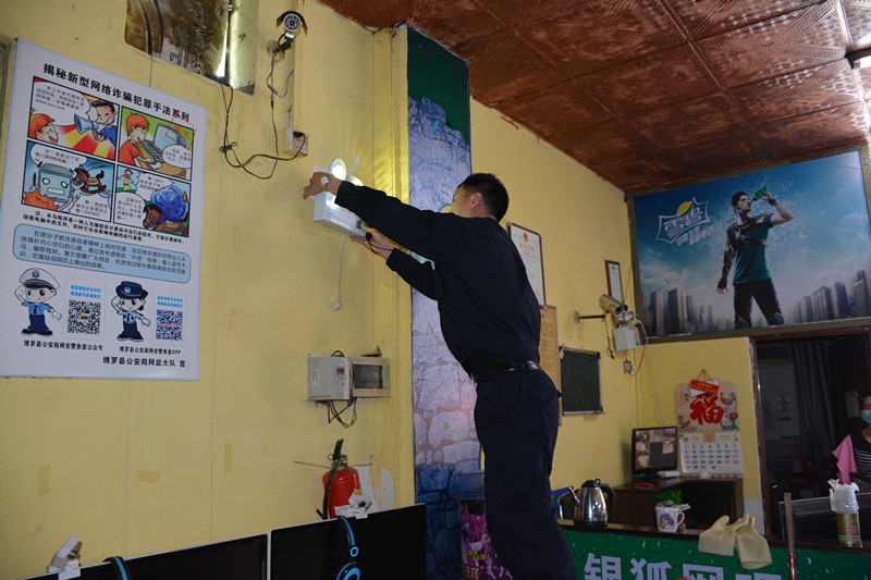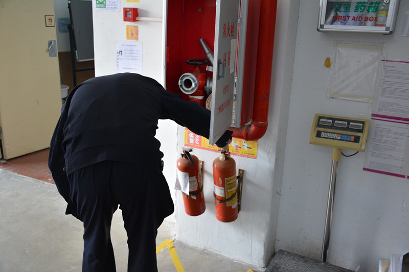 鎮(zhèn)派出所工作人員檢查滅火器、室內(nèi)消防栓。