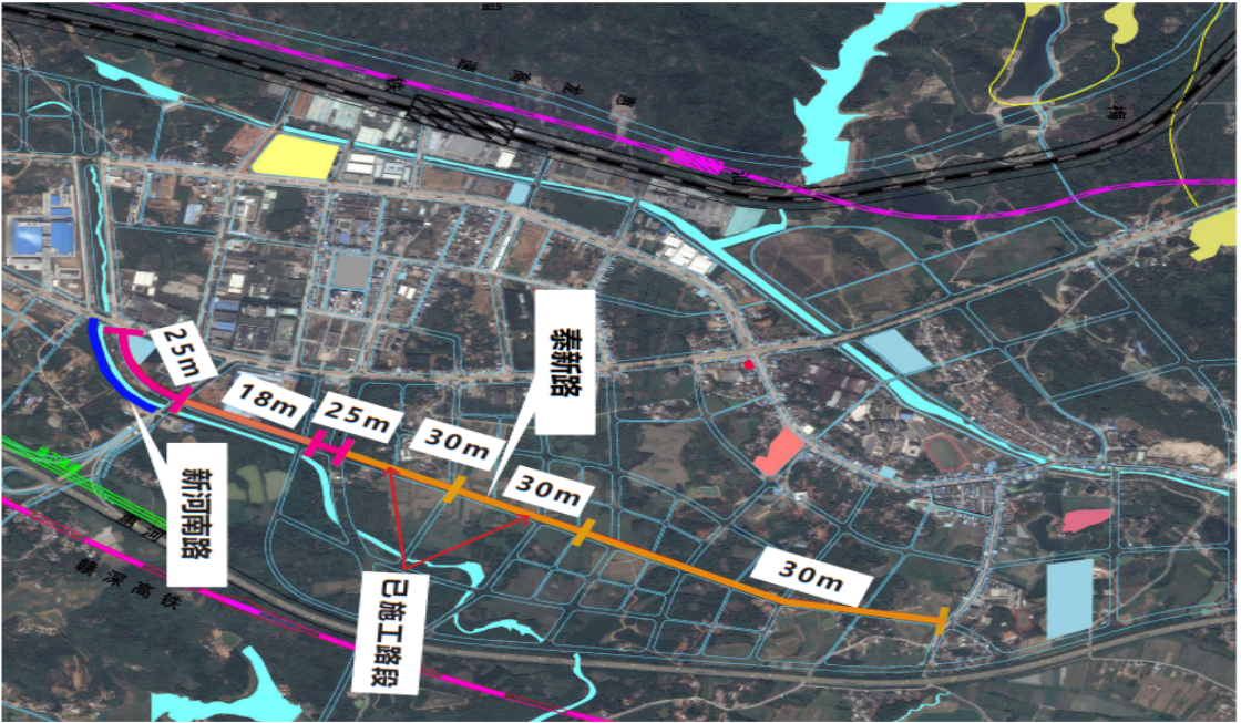 本項目泰新路西起金龍大道,北至建新路,道路全長約3218m,其中已施工路段約894m,本次設計路段約2322m,紅線寬度30/25m,雙向四車道,為城市主干道,建設內(nèi)容包括新建道路及交通設施、新建排水系統(tǒng)、電力通信系統(tǒng)、道路綠化及照明、給排水等。本項目總工期為2年。計劃投資人民幣約20435萬元。