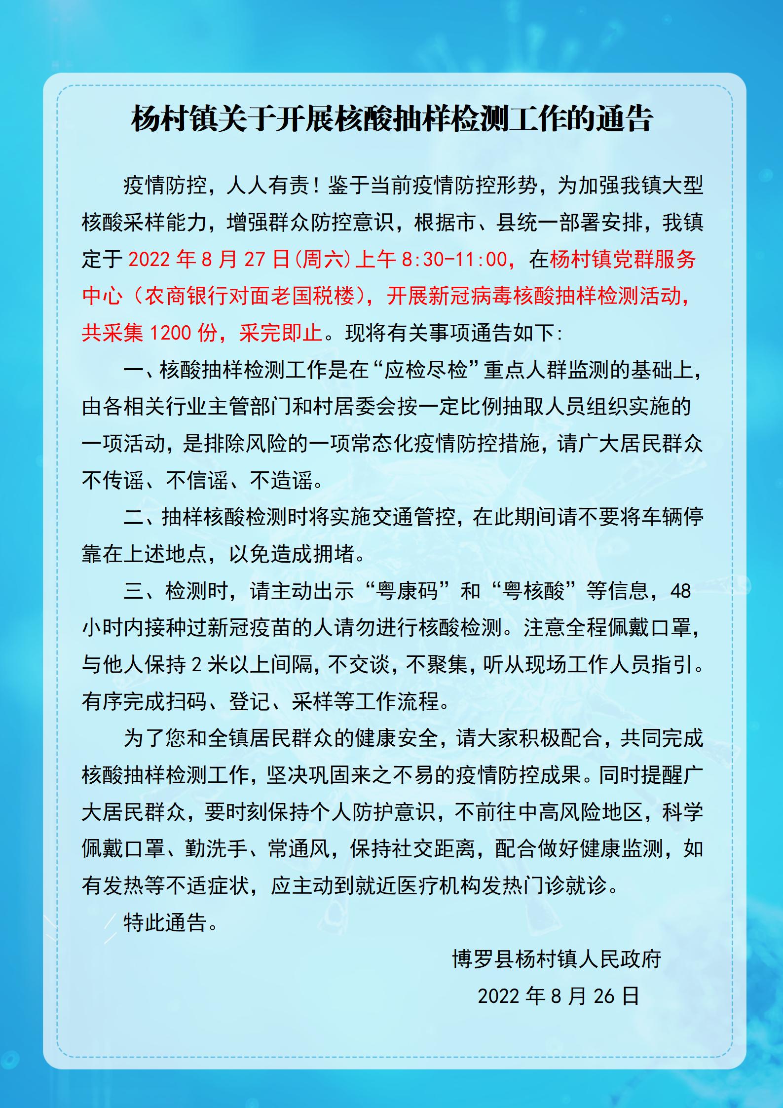 楊村鎮關于開展核酸抽樣檢測工作的通告