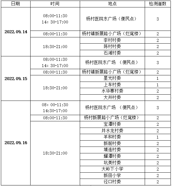 根據上級防控工作指引,為做好新冠肺炎疫情防控工作,切實保障人民群眾生命健康安全,經研究決定,楊村鎮將于2022年9月14日—16日開展區域核酸檢測,確保應檢盡檢,不漏一人。現將有關事項公告如下:
