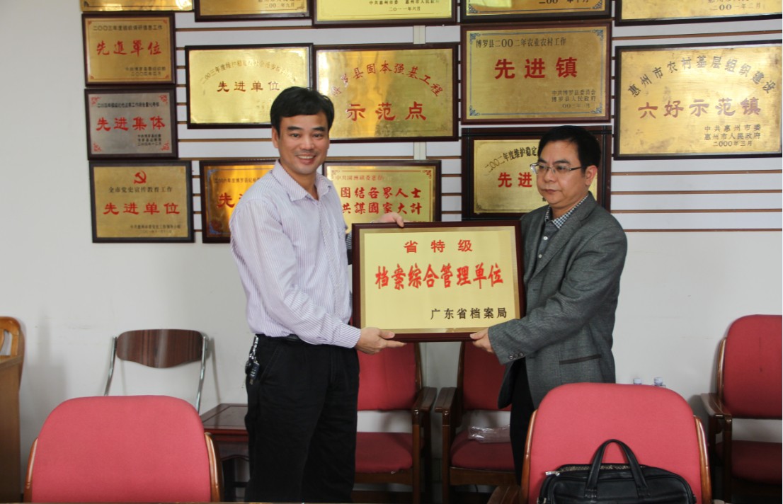 根據博羅縣園洲鎮《關于檔案工作目標管理晉升省特級》的申請,受省檔案局的委托,由市、縣檔案局組成的檔案工作目標管理認定組,在邱少雄副局長的帶領下,于2014年3月26日,到博羅縣園洲鎮進行檔案工作目標管理晉升省特級的認定。認定組通過實地查看、聽取匯報,現場評分認定,該鎮綜合檔案室的檔案工作總分和單項分均達到了省特級標準,順利晉升為省特級檔案目標管理單位。 園洲鎮領導重視檔案工作,成立了檔案工作領導小組,明確由一名副鎮長分管,辦公室主任主管,根據本鎮特點,實行“村檔鎮管”,使之更加有效地保管、利用好檔案資源,該鎮檔案管理制度健全,業務基礎扎實,保管設施較齊全,利用效果良好,走上了科學化、規范化和制度化管理軌道。 在認定會上,邱少雄副局長向該鎮頒發了“省特級檔案目標管理單位”的牌匾,并就繼續做好檔案的資源建設、安全保管、開發利用等工作提出了意見和建議。