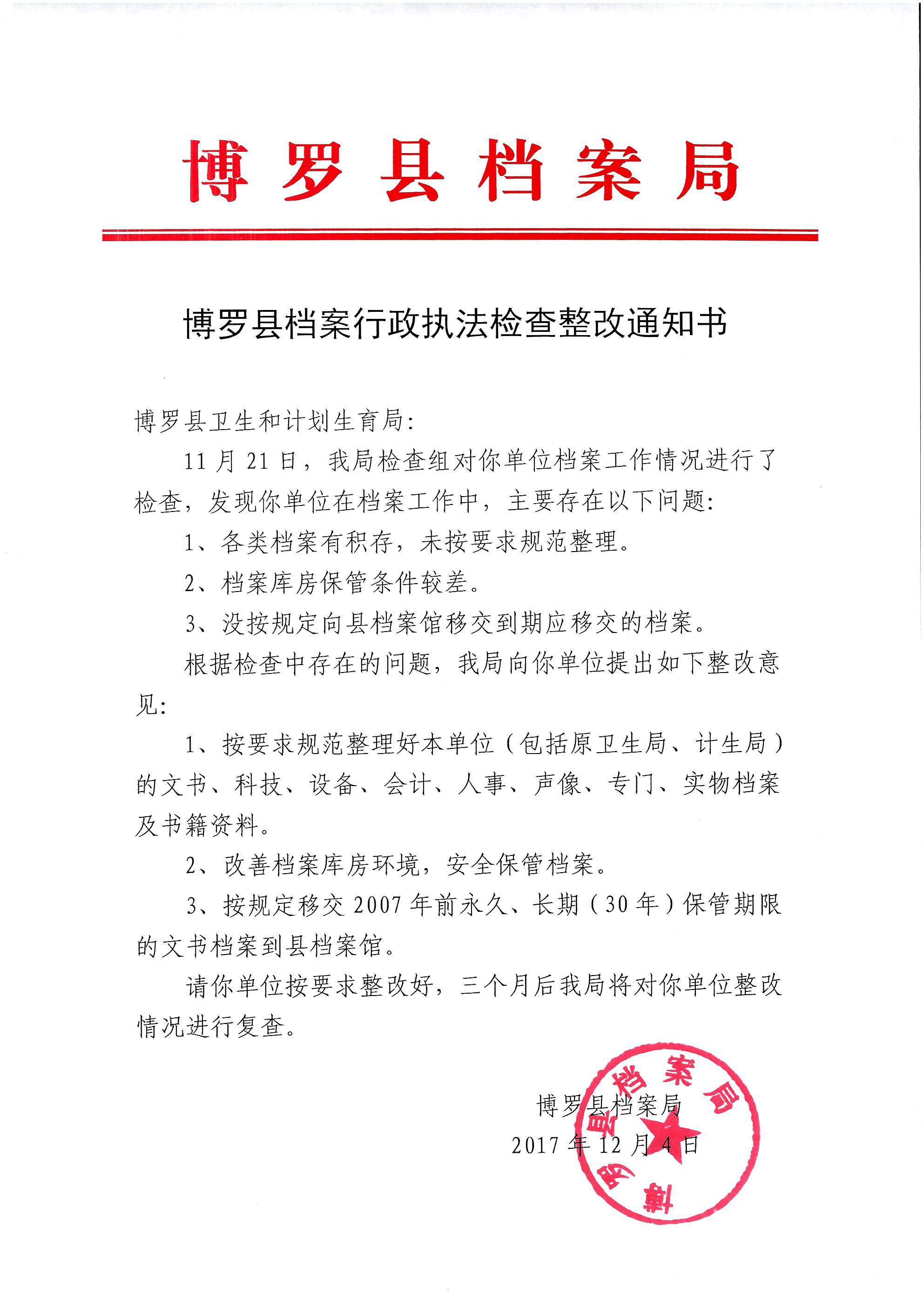 博羅縣檔案行政執(zhí)法檢查整改通知書(衛(wèi)計局)