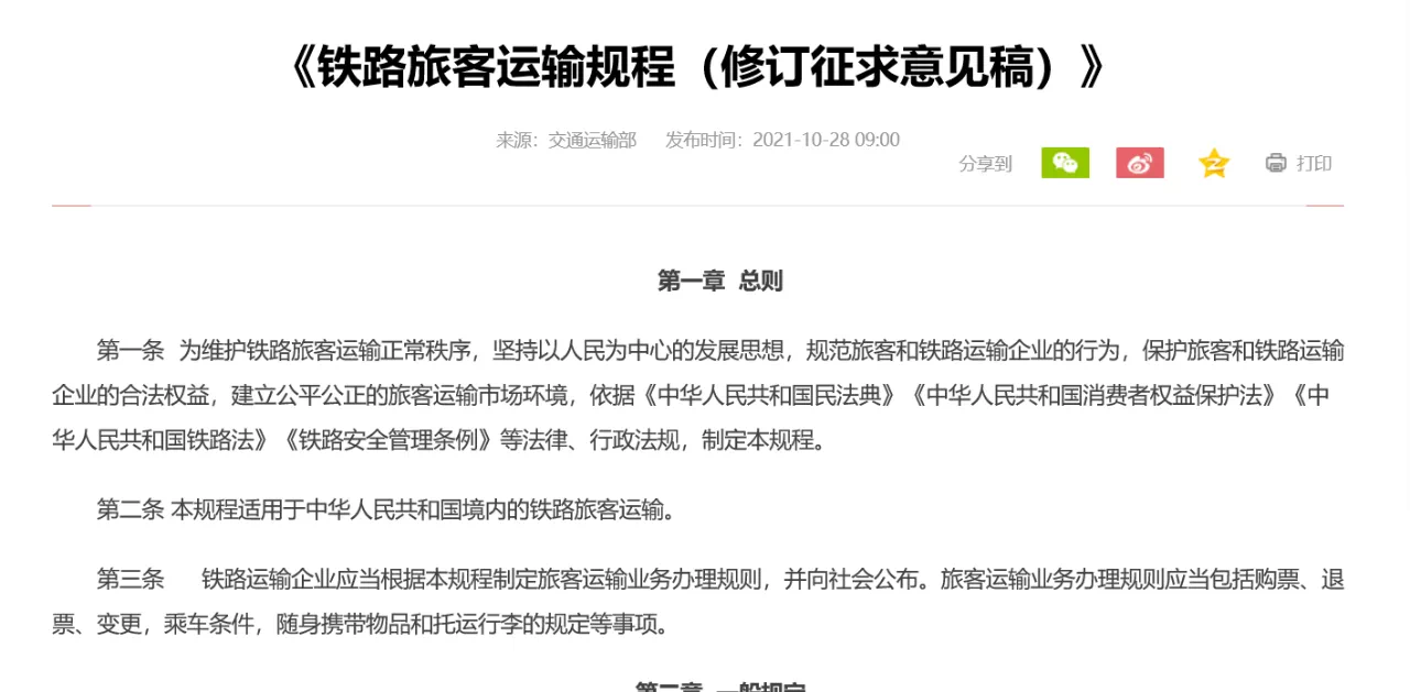 征求意見稿表示,為維護鐵路旅客運輸秩序,保護旅客合法權益,建立公平公正的鐵路旅客運輸市場環境,根據《中華人民共和國民法典》《中華人民共和國消費者權益保護法》《中華人民共和國鐵路法》《鐵路安全管理條例》等法律、行政法規,國家鐵路局在原鐵道部《鐵路旅客運輸規程》(鐵運〔1997〕101號)基礎上修訂形成《鐵路旅客運輸規程(征求意見稿)》,擬以規章形式發布。