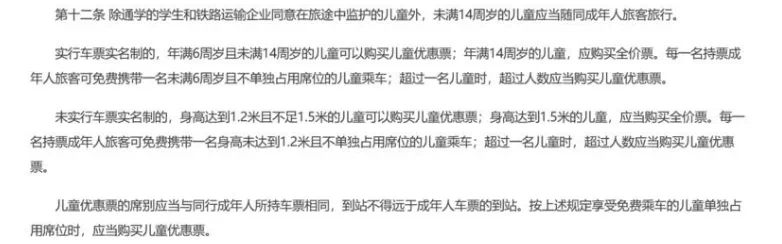 另外,兒童優惠票的席別應當與同行成年人所持車票相同,到站不得遠于成年人車票的到站。按上述規定享受免費乘車的兒童單獨占用席位時,應當購買兒童優惠票。