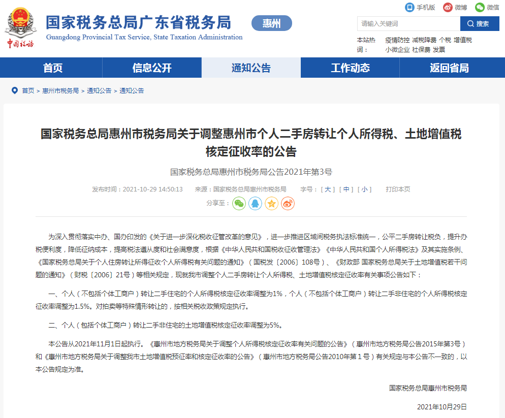 近日,惠州市稅務局、東莞市稅務局、珠海市稅務局、肇慶市稅務局、江門市稅務局、揭陽市稅務局分別發布公告稱:11月1日起個人轉讓二手住宅的個人所得稅核定征收率調整為1%,個人轉讓二手非住宅的個人所得稅核定征收率調整為1.5%。