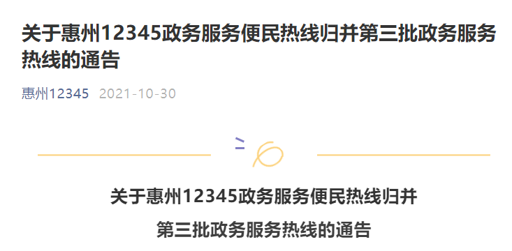 根據《關于印發惠州市進一步優化政務服務便民熱線工作實施方案的通知》(惠府辦函〔2021〕75號)要求,結合我市熱線歸并優化工作進展,惠州市政務服務數據管理局聯合有關部門以雙號并行和設分中心形式將12348全國公共法律服務專用電話等17條熱線歸并至12345熱線。