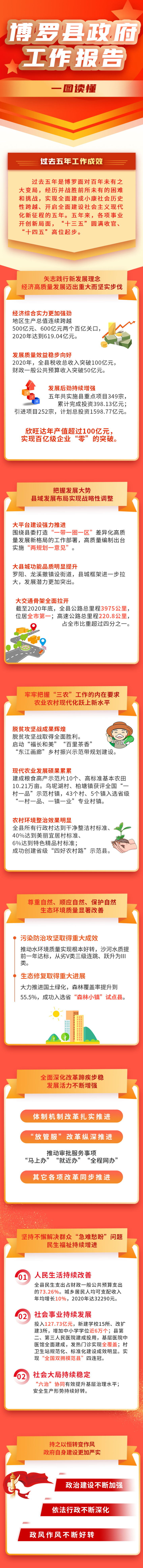 11月16日上午,博羅縣十七屆人大一次會議開幕,博羅縣委副書記、縣長邱志彪代表縣人民政府向大會作政府工作報告。報告中既回顧了過去五年的發展成果,也描繪了未來五年的美好藍圖。過去五年,博羅取得了哪些令人矚目的成績?未來五年有哪些目標?這些目標又將如何實現?我們帶您一圖讀懂。