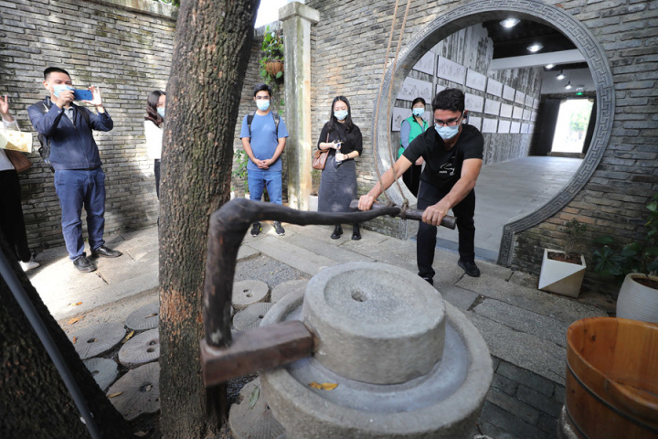 外國友人在客家婆景區石磨文化長廊參觀,并體驗石磨的樂趣。