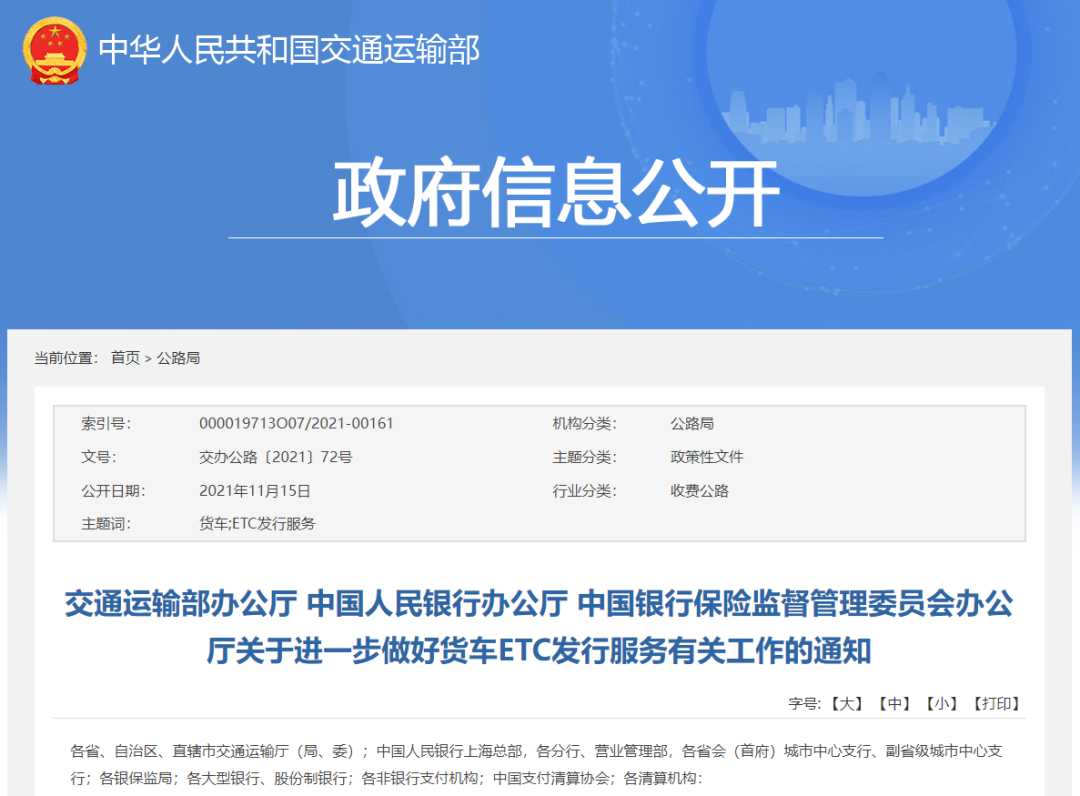 近日,交通運輸部等部門印發通知,要求進一步做好貨車ETC發行服務有關工作,全文如下: