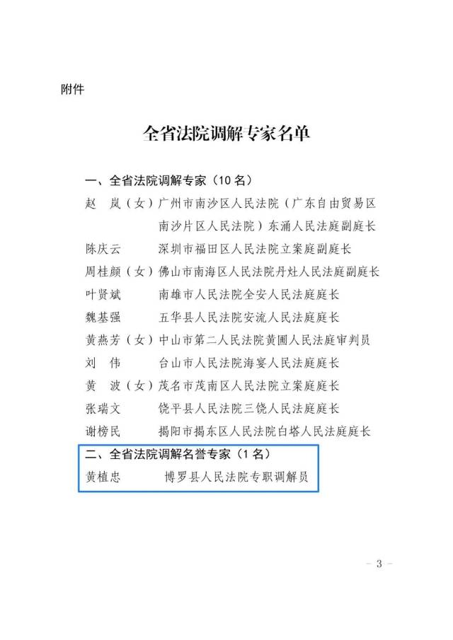 博羅縣人民法院專職調解員黃植忠同志(已退休)被評為“全省法院調解名譽專家”,是全省唯一一名獲此殊榮的調解專家!
