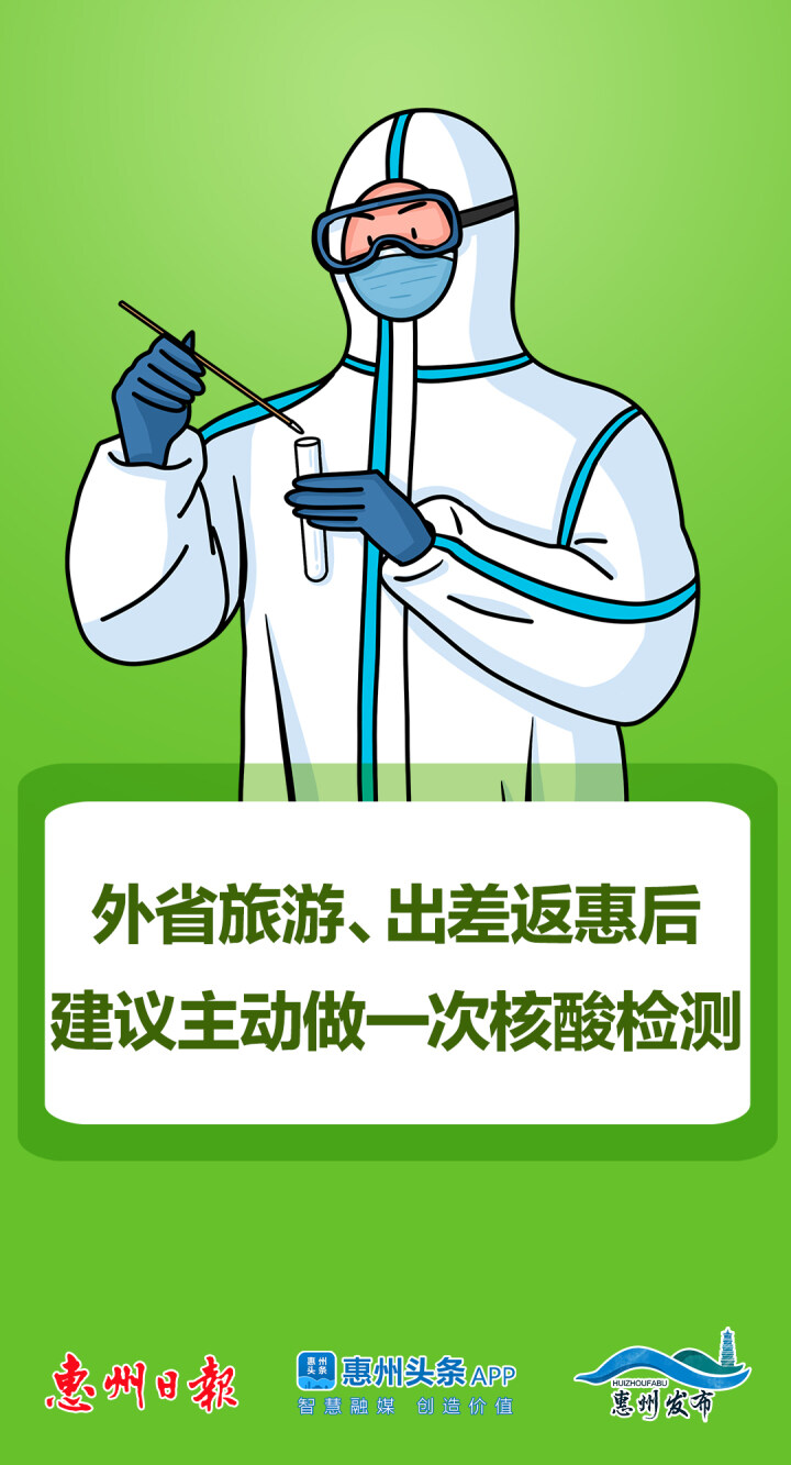 四、鑒于當前的疫情形勢,建議廣大市民近期非必要不前往中高風(fēng)險地區(qū)或有本土病例報告地區(qū)的城市,從外省旅游、出差返惠后,建議主動做一次核酸檢測并自我健康觀察14天。如有出現(xiàn)發(fā)熱、干咳、乏力、咽痛、嗅(味)覺減退、腹瀉等不適癥狀時,盡早到附近醫(yī)院發(fā)熱門診就診,并告知醫(yī)生旅居史,不要自行用藥;就醫(yī)途中全程佩戴口罩,避免乘坐公共交通工具。