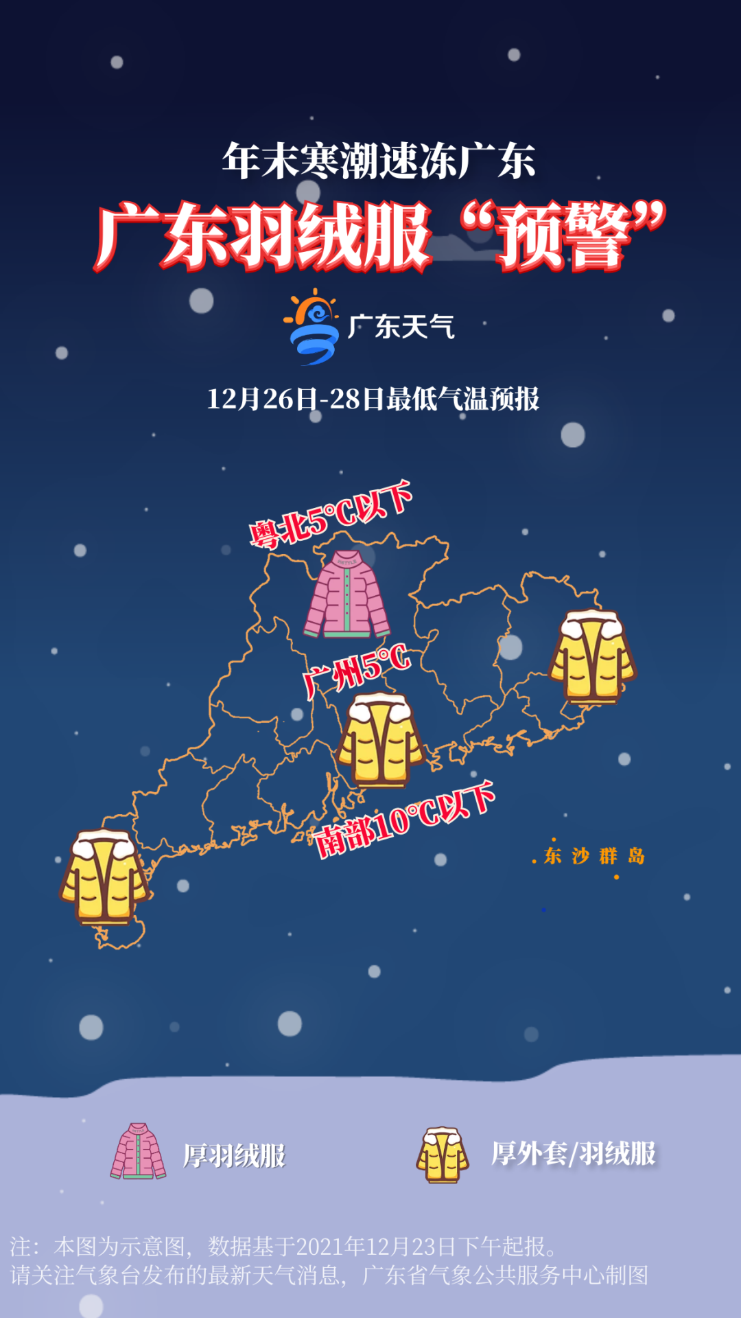 過程最低:27日-28日早晨最冷,中北部有大范圍5℃以下低溫,其中粵北高寒山區低至零度或以下,廣州5℃左右,南部10℃以下。