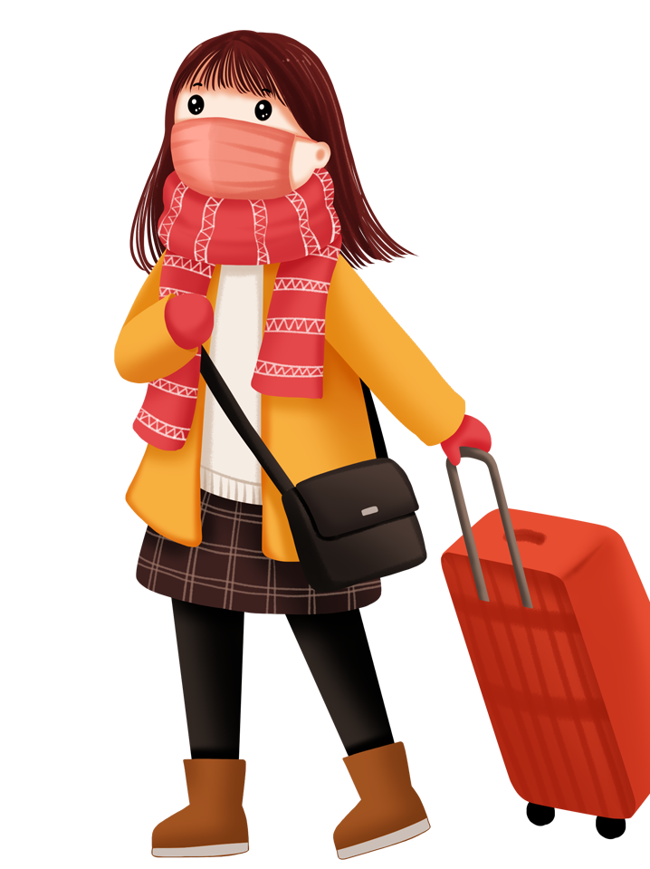備足出行期間所需的口罩、清洗劑、免洗手消毒液、紙巾等用品;注意氣候變化,備齊保暖衣物,防止著涼。