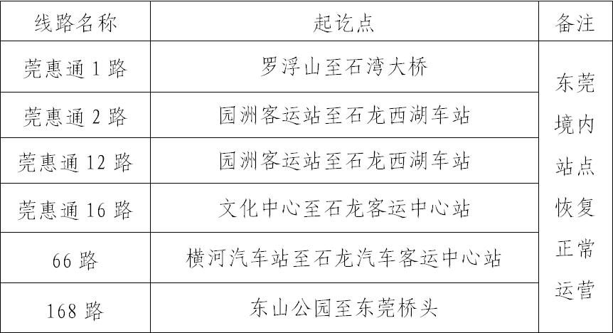 根據(jù)國(guó)家和省關(guān)于應(yīng)對(duì)新冠肺炎疫情分區(qū)分級(jí)防控的工作要求,自2022年1月5日零時(shí)起,東莞市大朗鎮(zhèn)長(zhǎng)塘社區(qū)長(zhǎng)塘花街二街(133號(hào)、143號(hào)、163號(hào))由中風(fēng)險(xiǎn)地區(qū)調(diào)整為低風(fēng)險(xiǎn)地區(qū)。調(diào)整后,東莞市全域均為低風(fēng)險(xiǎn)地區(qū)。根據(jù)縣防控辦有關(guān)要求,1月6日起,我縣前期受疫情影響停運(yùn)或調(diào)整的公交線路恢復(fù)正常運(yùn)營(yíng)。具體線路如下: