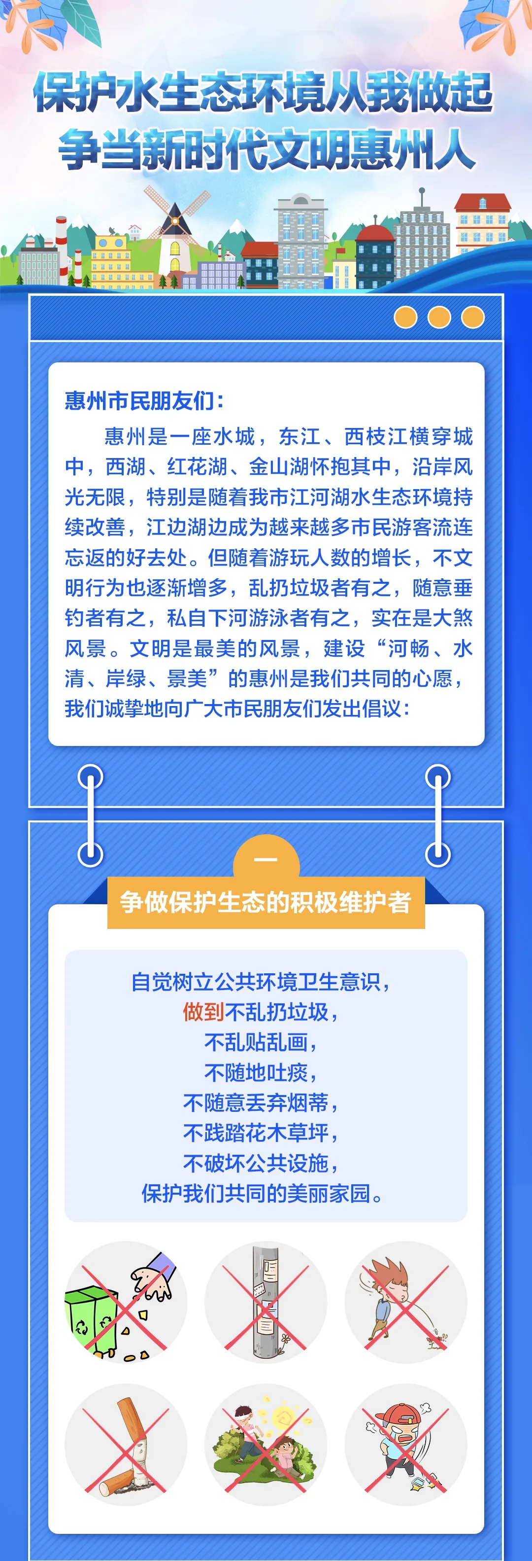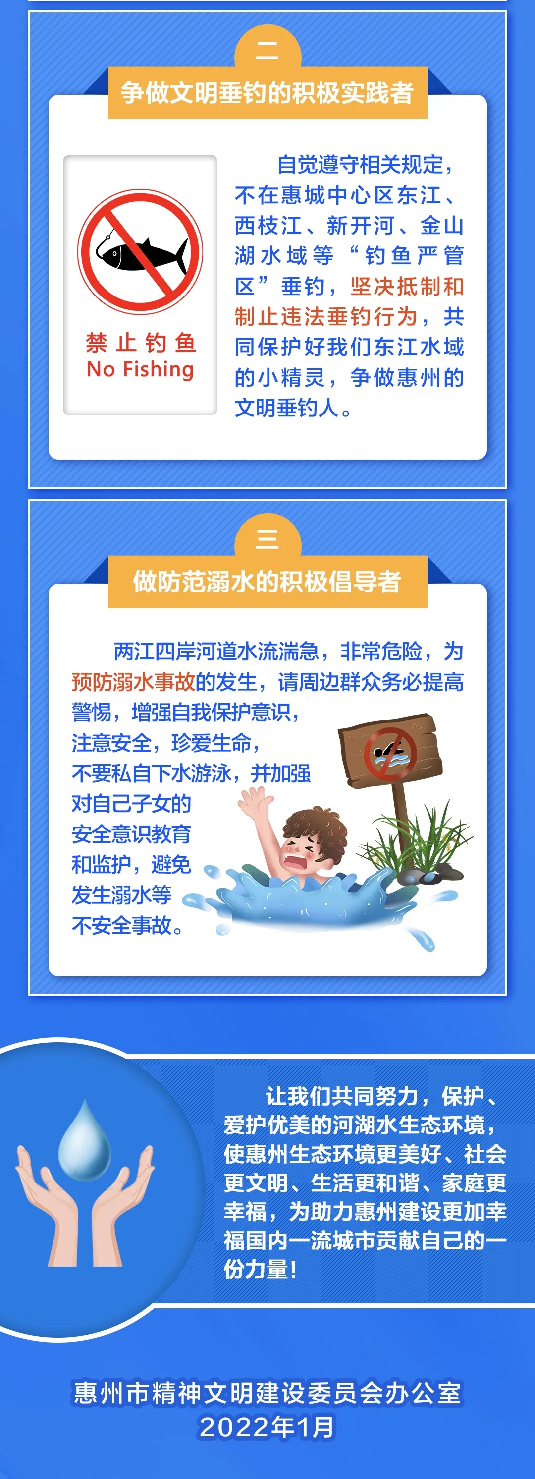 “愛護河湖人人有責,保護水環境需要我們每個人從小處做起,從身邊做起,需要全社會的共同努力。我們相信有您的愛心呵護,惠州河湖一定會更加清潔美麗,人民生活將更加幸福精彩!”市河長辦倡議:親愛的市民朋友們,讓我們進一步增強愛河、護河意識,把愛護河湖生態、保護水環境作為一種思想自覺和行動自覺,為給我市建設珠江東岸新增長極、粵港澳大灣區高質量發展重要地區和更加幸福國內一流城市提供水資源保障盡一份心、出一份力。