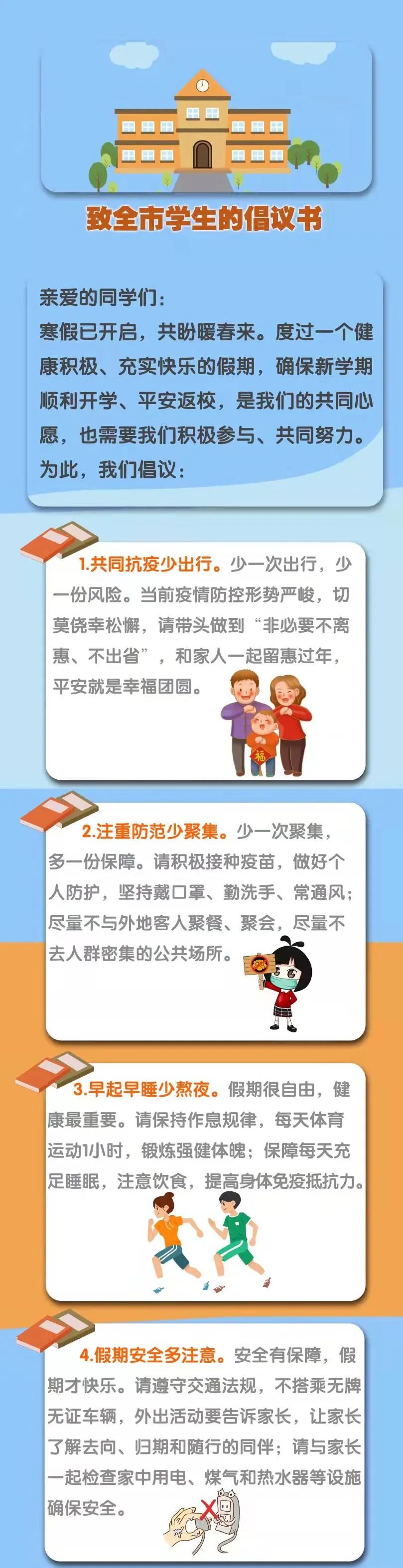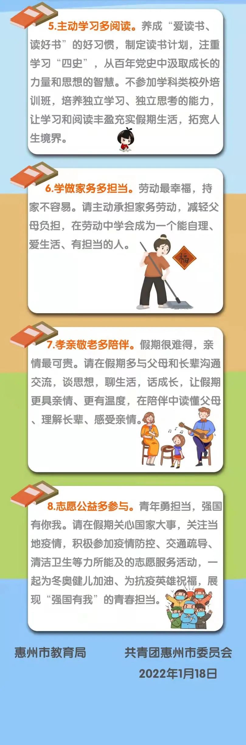 1月18日,惠州市教育局、共青團惠州市委員會聯合向全市學生發出倡議,希望大家做到少出行、少聚集、少熬夜,多閱讀、多擔當、多陪伴等,度過一個健康積極、充實快樂的假期,確保新學期順利開學、平安返校。