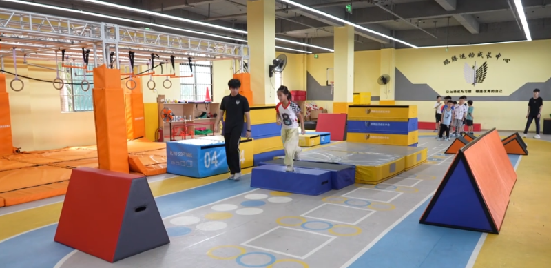 在縣城一家少兒體適能中心,在專業教練的趣味引導下,一群3至12歲的小朋友或專注地跨越障礙、靈活攀爬,或嘗試“過河石”“蹦床”等平衡訓練。