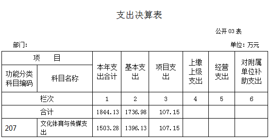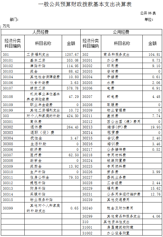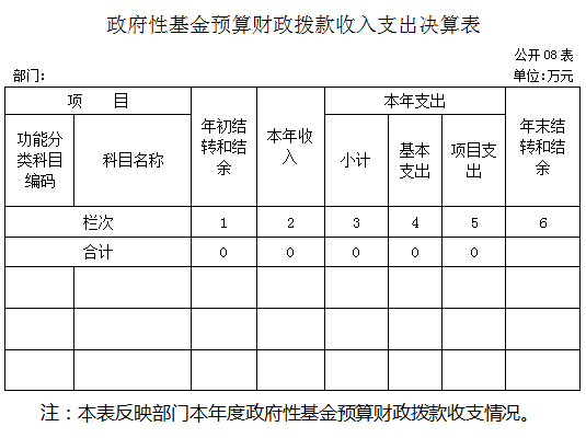 各部門應當公開8張部門決算表格,包括:1.收支總表(3張),即:《收入支出決算總表》、《收入決算表》、《支出決算表》;2.財政撥款收支表(5張),即:《財政撥款收入支出決算總表》、《一般公共預算財政撥款支出決算表》、《一般公共預算財政撥款基本支出決算表》、《財政撥款“三公”經費支出決算表》和《政府性基金預算財政撥款收入支出決算表》。除涉密信息外,《收入決算表》、《支出決算表》、《一般公共預算財政撥款支出決算表》和《政府性基金預算財政撥款收入支出決算表》應當細化公開到支出功能分類項級科目,《一般公共預算財政撥款基本支出決算表》應當細化公開到經濟分類款級科目。