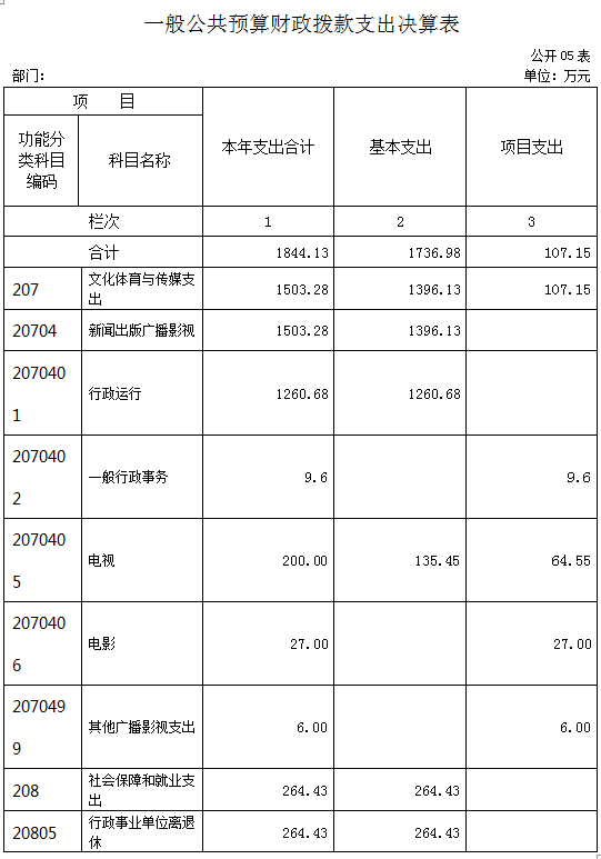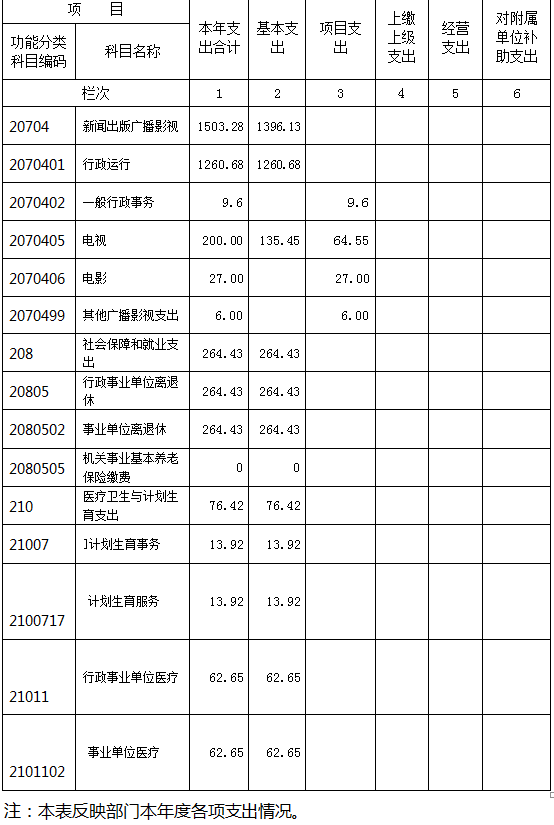 分功能科目看,文化體育與傳媒支出1503.28萬元,主要用于行政運行1260.68萬元,一般行政事務9.6萬元,電視200.0萬元、電影27.0萬元和其他廣播影視支出6.0萬元;社會保障和就業支出264.43萬元,全部為事業單位離退休費支出;醫療衛生和計劃生育支出76.42萬元,主要用于計劃生育服務13.92萬元,事業單位醫療62.65萬元。