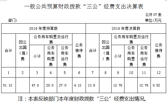 2016年“三公”經費財政撥款支出決算中,因公出國(境)費 0萬元,占0 %;公務用車購置及運行維護費支出12.76萬元,占92.46%;公務接待費支出0.52萬元,占7.54%。具體情況如下: