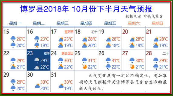 10月24號霜降,10月下半月氣溫19~32℃,早晚溫差較大,陰天較多,天氣變化節奏快,請密切留意縣氣象臺發布的最新天氣預報預警信息,合理安排生產作業。